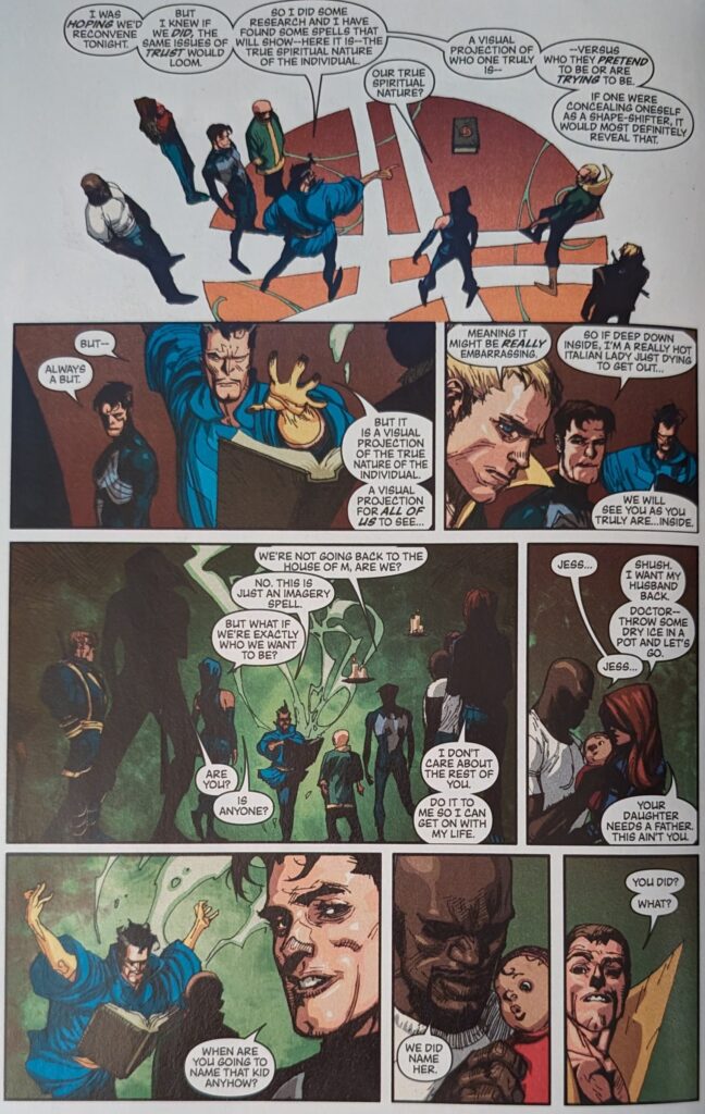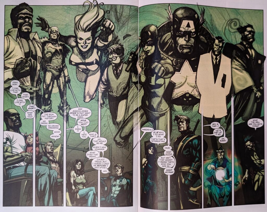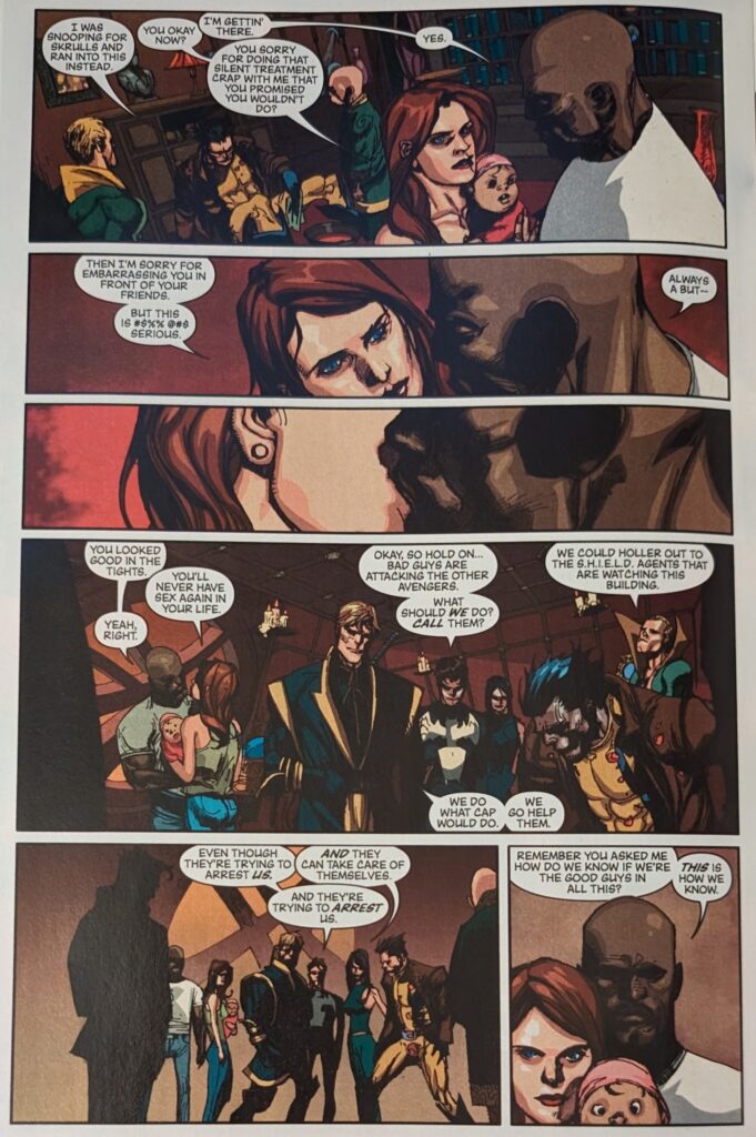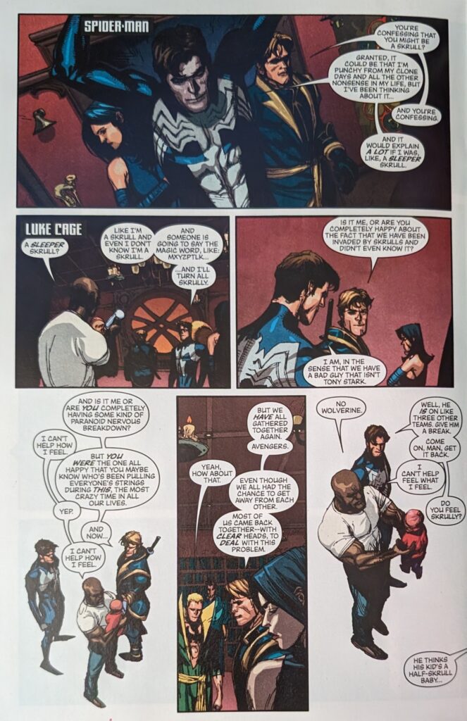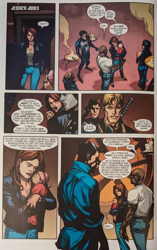 …but sometimes, the thing inside the Hood comes out. That buys him a chance to smash through the window and escape, leaving Wolverine to sit and heal and drink free booze in the wreckage of the bar. Next morning, we learn Dr. Strange and the Night Nurse are in a relationship. Maybe I woulda already known that if I’d read some Dr. Strange comic, but I have not historically read some Dr. Strange comic. Strange is worrying about who will or won’t show up tonight to rejoin the team. Night Nurse leaves, but Strange asks her to come back for the meeting. As she goes, we see Clint is still in Strange’s house, and apparently so is Echo, who accidentally walks in on him taking a shower. The Avengers comics always used to be full of relationships and maybe-relationships and stuff. These days they’re strictly fight comics, and have been for years. No one bothers with the people in the costumes anymore. I am very disgruntled with the state of comics in 2024, as I write this. Maybe it’ll be better by the time this post goes up in 2026. Then Danny Rand is shown hanging out later, asking Strange if he can help prevent anyone from weakening his iron fist by tapping into the same power. In the Brubaker/Fraction/Aja instant classic Iron Fist run happening during this, Danny has learned the last person to hold the mantle of Iron Fist is still alive, and might not be the only one, even. It’s a great book! Strange says he can’t do anything, and then an unseen person arrives yelling “I’m a Skrull!” and you can probably guess who that is.