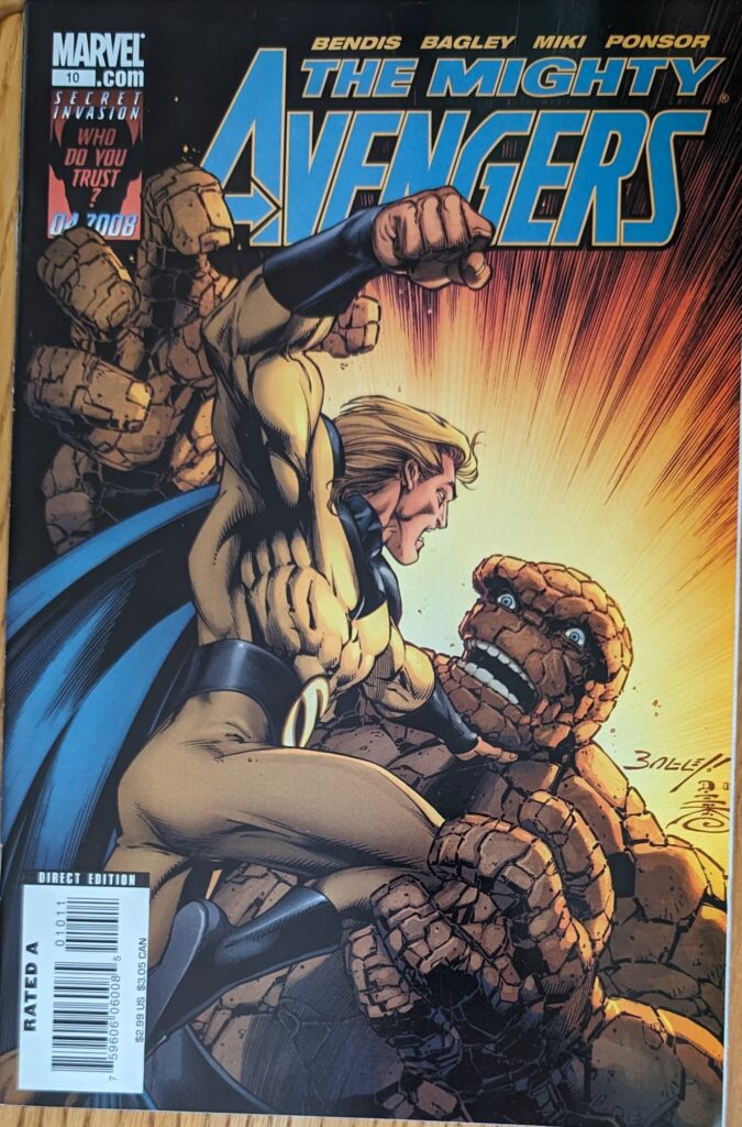 Bendis… not really doing Doom right. And that will get worse before we’re done. He’s trying, he just can’t seem to crack people with very specific speech patterns. Emma Frost, Beast, Black Panther, Thor, Doom… not in his wheelhouse. Well, poor Ben Grimm is about to enjoy a big cartoon sandwich when Sentry comes in, and when he wants to get into Reed’s lab without permission, it’s fightin’ time. He chucks Ben out a window, and then the gang enters the building.