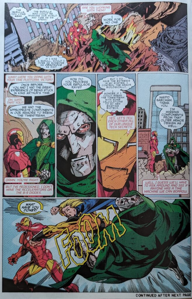 IM and Doom manage to get Bob to stop raging, and Tony explains what’s happening, and then asks who has a time machine in this period. Doom says only one man. It’s Reed Richards, who’s confiscated Doom’s own time platform. But that leaves them the trouble of getting into the Baxter Building without anyone knowing.
