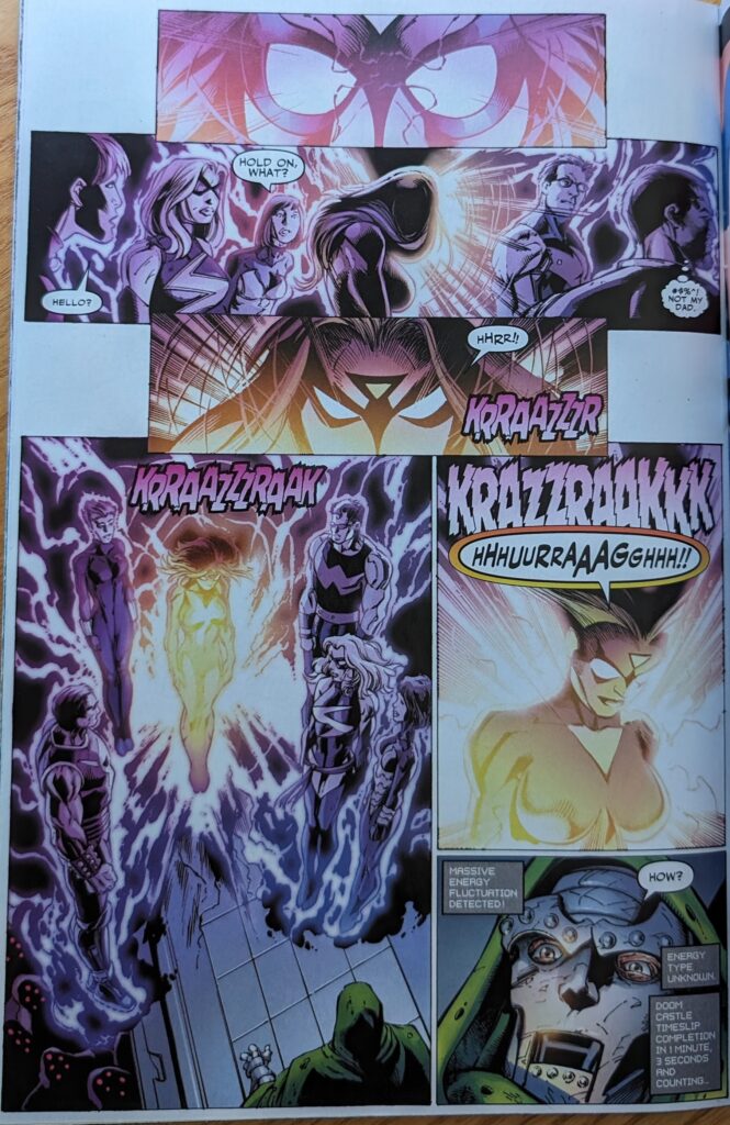Yeah, this dialogue sucks. And is weird. Bendis tended to fall back on women calling each other fat and other type insults sometimes (even tho every woman in superhero comics is almost comically perfect, mind), but to have Doom getting all sassy about it is not great! Your cow-mouth and your whore’s heart. Could be an R. Kelly song. Not only is it not pleasant to read, it feels wrong for the character. Too personal. Doom can’t come up with insults that specific for Reed Richards, and he REALLY hates that guy. It just doesn’t play.