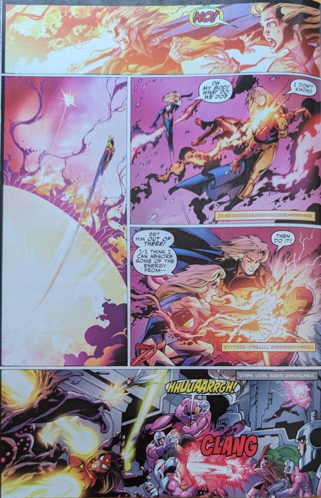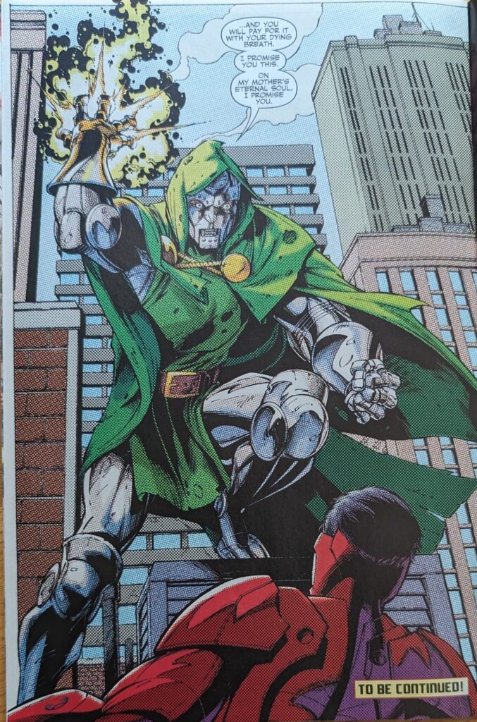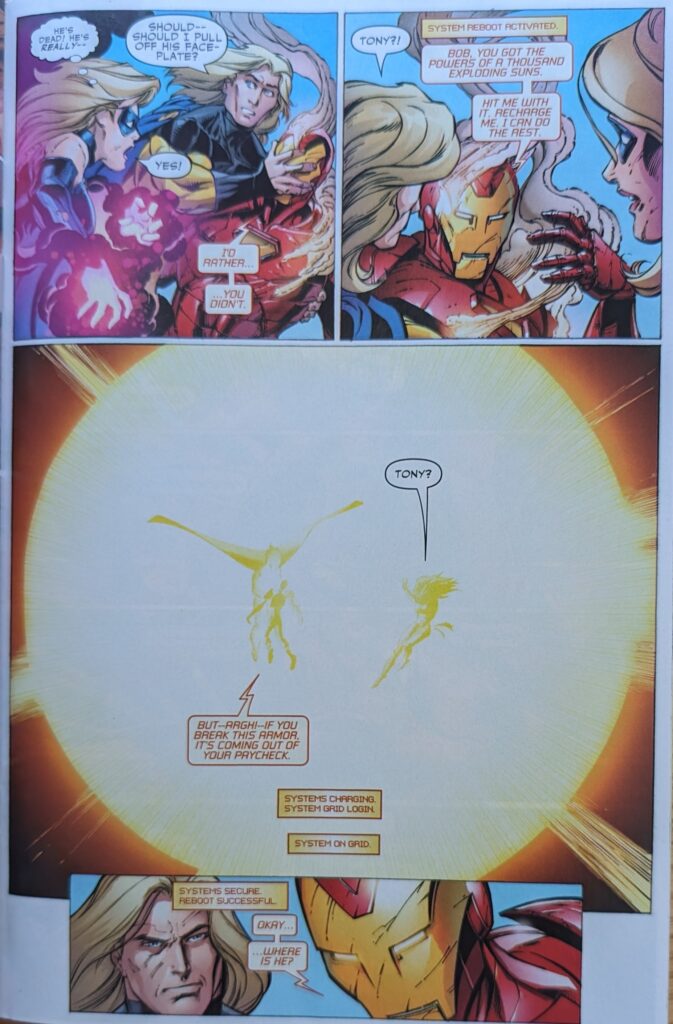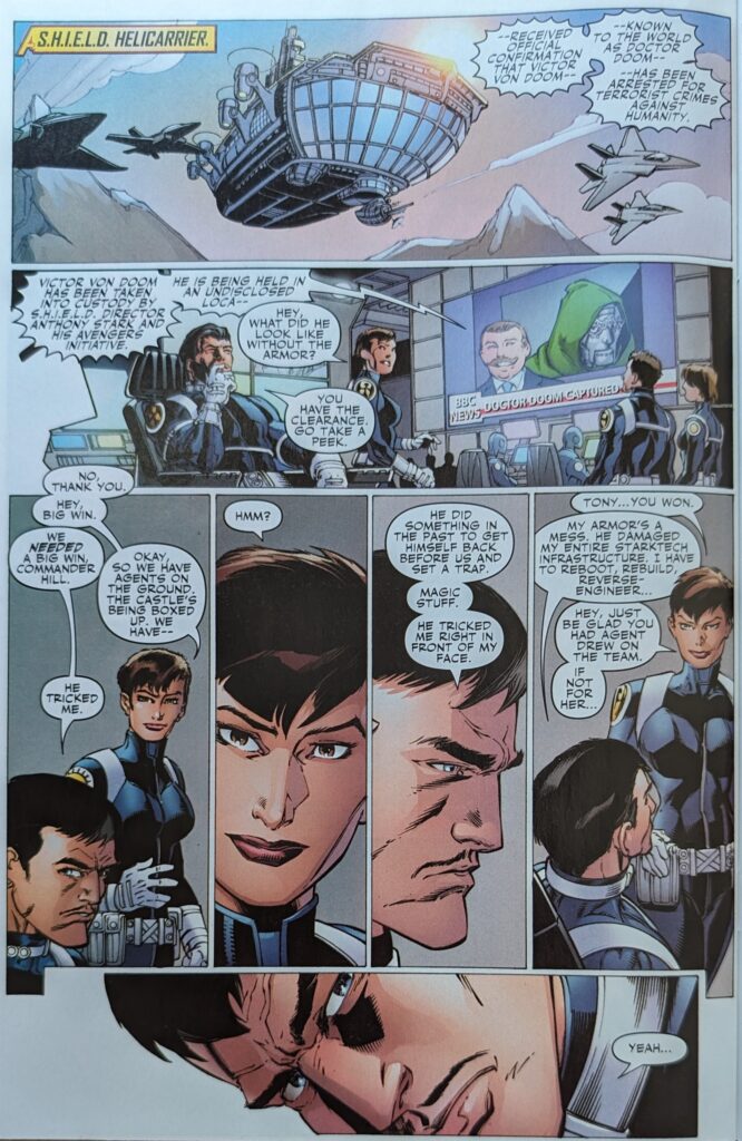Only 2 stories into this series and Iron Man has been disabled and maybe killed twice. It’s a bit much. The others are inside fightin’ it up still, until Sentry is suddenly right in Doom’s face, ripping his mask and chestplate off, immobilizing him.