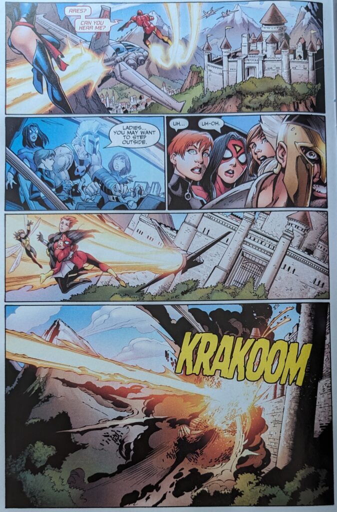 How, indeed? Spider-Woman blasts everyone loose, and now we got a fight. Ares dives into Doom, Carol gives some orders and flies out to find Iron Man and Sentry, and then we catch up to the end of last issue, big explosion.