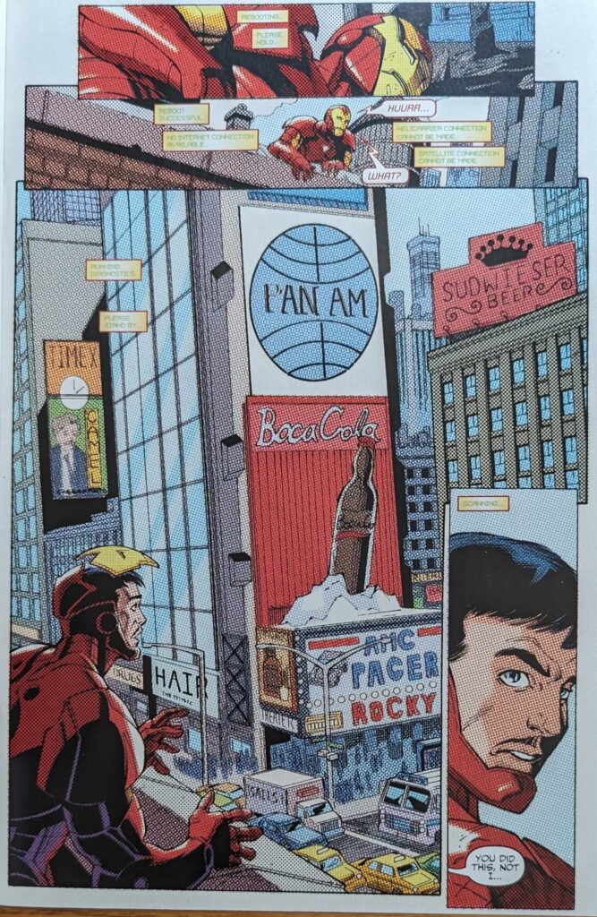 Yes, Thor has been back for about 9 months, I looked it up. J. Michael Strackzynski and Olivier Coipel picked up the threads JMS put in FF to have Thor and the Asgardians slowly returning after Ragnarok, and also Thor moved Asgard to Broxton, OK to be closer to humanity. This was a big deal at the time, and I was pretty surprised to learn Dan Jurgens already did that move when we looked at Thor, Vol. 2 #51. But no one read that comic, I guess, so it was treated like a major status quo shift in this time. Coipel has given Thor a very cool costume redesign (briefly glimpsed at the end of NA 36) and the book is pretty good despite saddling Thor with Don Blake again. In 2009, JMS will abruptly abandon it mid-story, as he tends to do. He keeps doing this unprofessional stuff and they keep hiring him. Anyway, Bob watches the Void emerge from the bank with some goons and get in a fight with his past self and kinda loses it, crumpling on a rooftop. Meanwhile, Doom is trying to kill Tony, who finally gets him to stop by reminding him they could cease to exist in the present if they alter the past. Then he wants to know if Doom is “working with them,” but Doom doesn’t know what that means.
