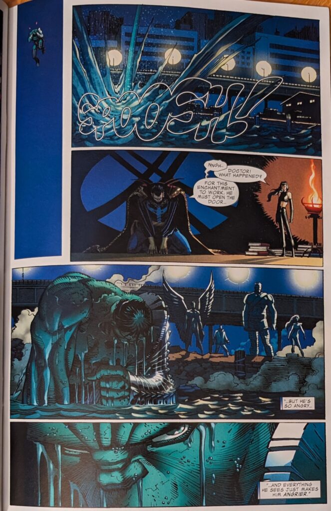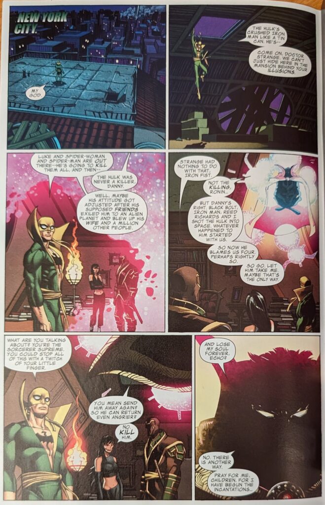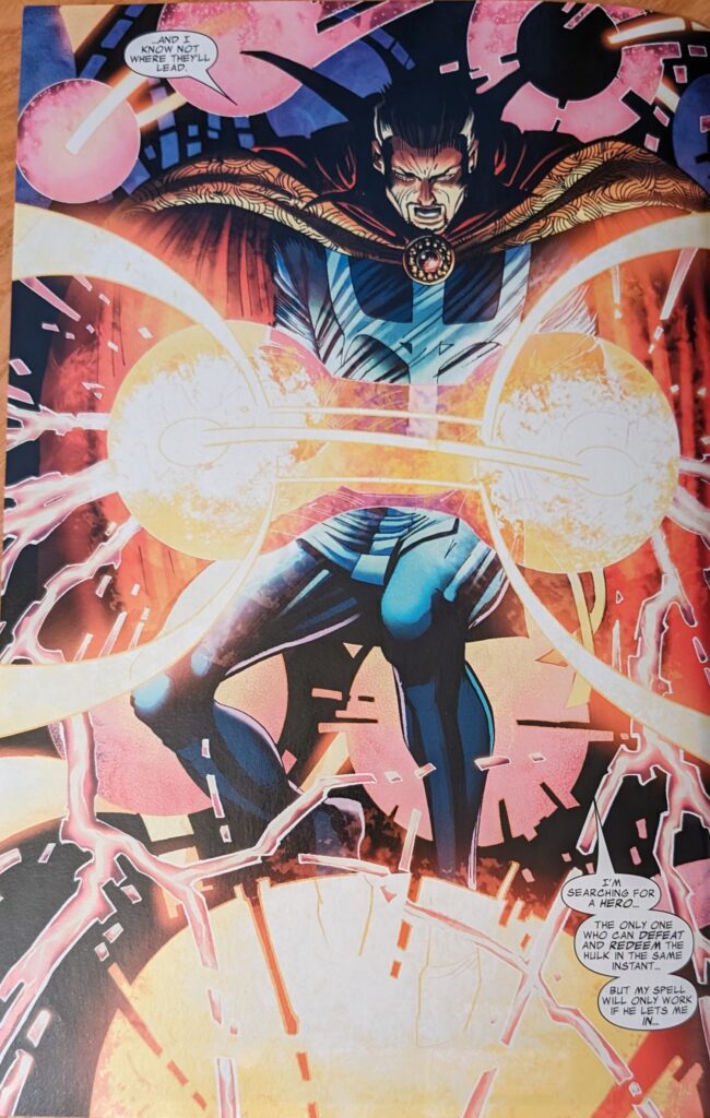 Gotta have Rick Jones show up to one of these things. The Warbound know who he is, bringing up how he abandoned Hulk for Captain America IN THE 60s, and accuse him of being a tool of Cap’s, so Rick gets to tell his old friend that his other old friend is dead. Rick seems to be getting through to him, getting him to calm down, so of course, that’s when Dr. Strange puts the whammy on him.