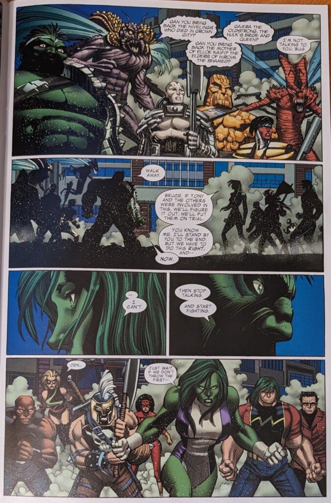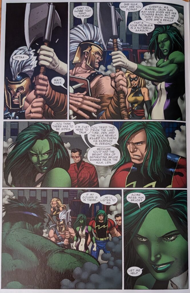 Real Ditko hours. Back at the fight, Hulk is dragging Iron Man out of the wreckage as Luke Cage, Spider-Man, Ms. Marvel, Ares, Doc Samson, Spider-Woman and others prepare to face off with him. But then his Warbound show up, his alien homeboys, ready to defend their leader who clearly doesn’t need it. Area decides to just lay into them, but…