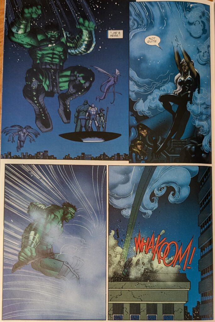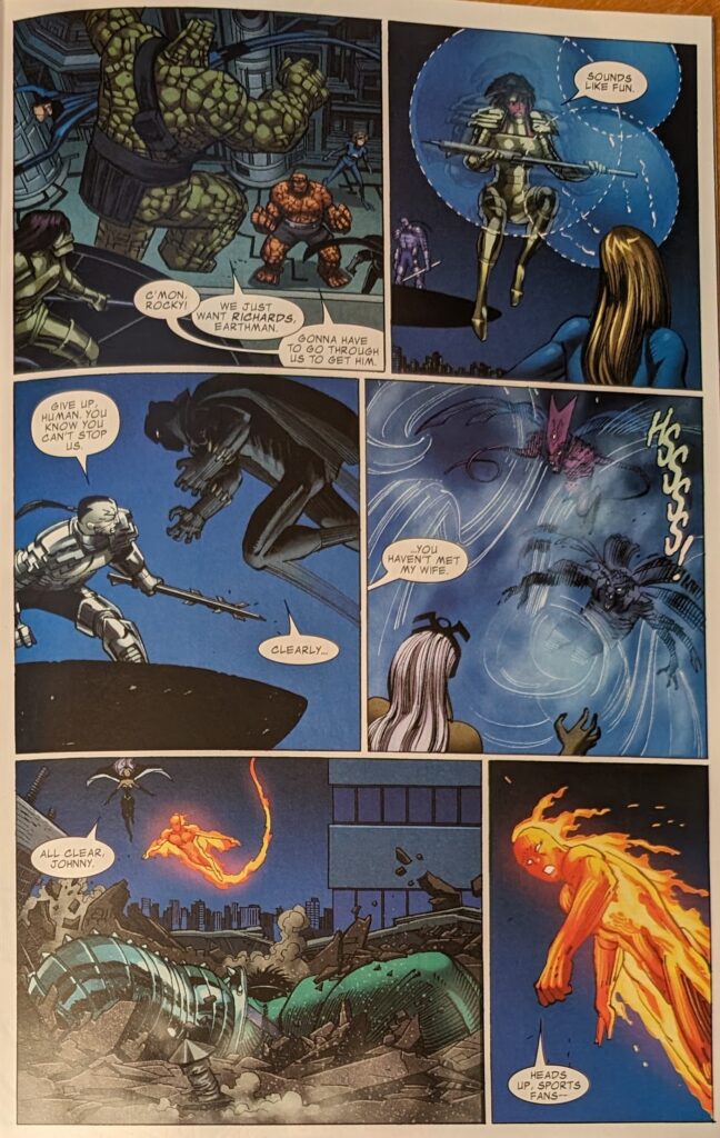 Hulk puts down Ares with one hit, which is pretty fun, and then everybody’s fightin’ everybody. As the heroes brawl with the aliens, Spider-Woman points out they don’t have a chance, that they can’t win a fight like this. Ms. Marvel says hopefully they won’t have to, that they’re buying time for Reed Richards. The FF (Which is currently Human Torch, Thing, Black Panther and Storm, you’ll recall) are joined by Reed & Sue on the roof of the Baxter Building, where Reed is building a giant thing, as he so often does, with the help of T’Challa’s intellect and Storm’s lightning. Reed thinks it’s done, and urges the others to leave, saying it’s not their fight.