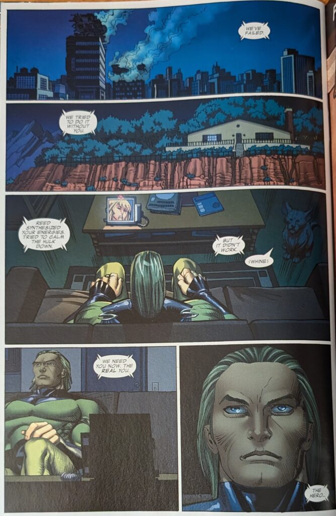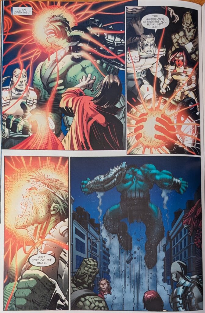 It appears the Sentry has come to calm Hulk down in a flash of light. Thing tells Korg the Sentry always could, because he and Hulk were true friends. But then it’s not Sentry, it’s Reed in some weird light rig, for some reason, mostly because this comic has 3 more issues. So Hulk proceeds to beat the hell out of Reed, smashing through Sue’s force fields to do it. Once her husband is quite literally flattened, Sue calls the real Sentry. Why did they not do this first?