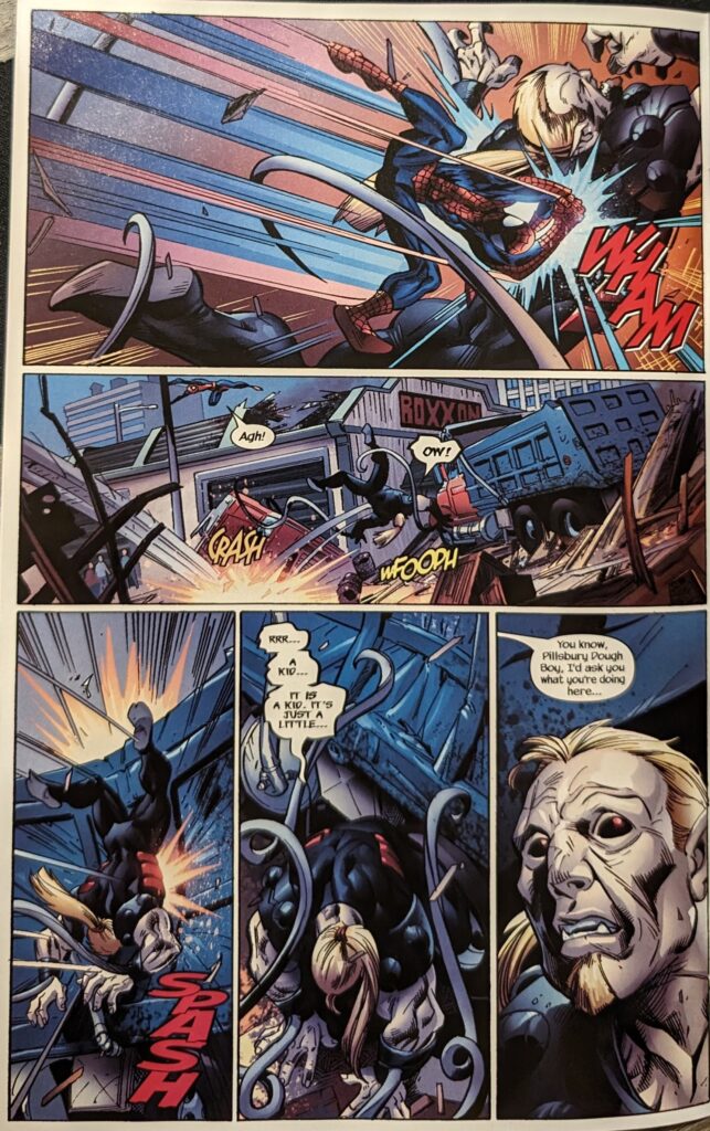 Bendis couldn’t possibly have known I would one day be reading this as the first issue back after 134 issues of ever-decreasing enjoyment in the main books, but man, did he do a perfect “James Bond cold open” to bring me back in. Well, as the guy names after a Bendis Boarder keeps talking to Damage Control, Silver Sable (Concealed in shadow) is listening in with one of those movie spy listening things. And she’s confirming to Mr. Roxxon (Concealed in shadow) that Spider-Man was involved. Mr. Roxxon? Surely you can’t think that could be someone’s name? Ah, well. Mr. Roxxon is truly baffled as to why Spider-Man has now defending something of his twice in a month, and wants him brought in. He thinks Spider-Man knows who’s attacking Roxxon, though of course, it’s a coincidence. The last one was Killer Shrike in USM 72, we shall recall. Barely a cameo! Two weeks ago, Spider-Man was spotted by one of the many agents Sable has staking out Manhattan, and Sable’s goons proceeded to follow him in a helicopter until he dropped into an alleyway and disappeared. One week ago, they spotted him going to Midtown High.