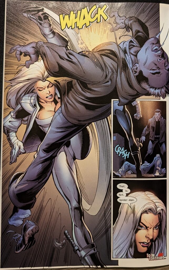 “Hi, it’s me, Silver Sable. Remember? That time I drugged you somehow despite your Spider Sense and kidnapped you and saw your face, like, a lot, and would therefore know you aren’t you, and then Venom kidnapped me for no obvious reason on that bridge, when all he wanted was to kill you, and you had to come after me? No?” It’s bonkers that Bendis is still asserting that game is in-continuity! The back of this issue is part one of a serial running through the Ultimate books introducing Ultimate Vision. It’s by Mark Millar (Booooo) and John Romita, Jr. (Yaaaaaay), but it doesn’t have Spider-Man in it, and I also only have parts of it since it was serialized through the whole line, so we’re not gonna look at it. No detours this time, no sir. This is a USM block. A glorious, glorious USM block.