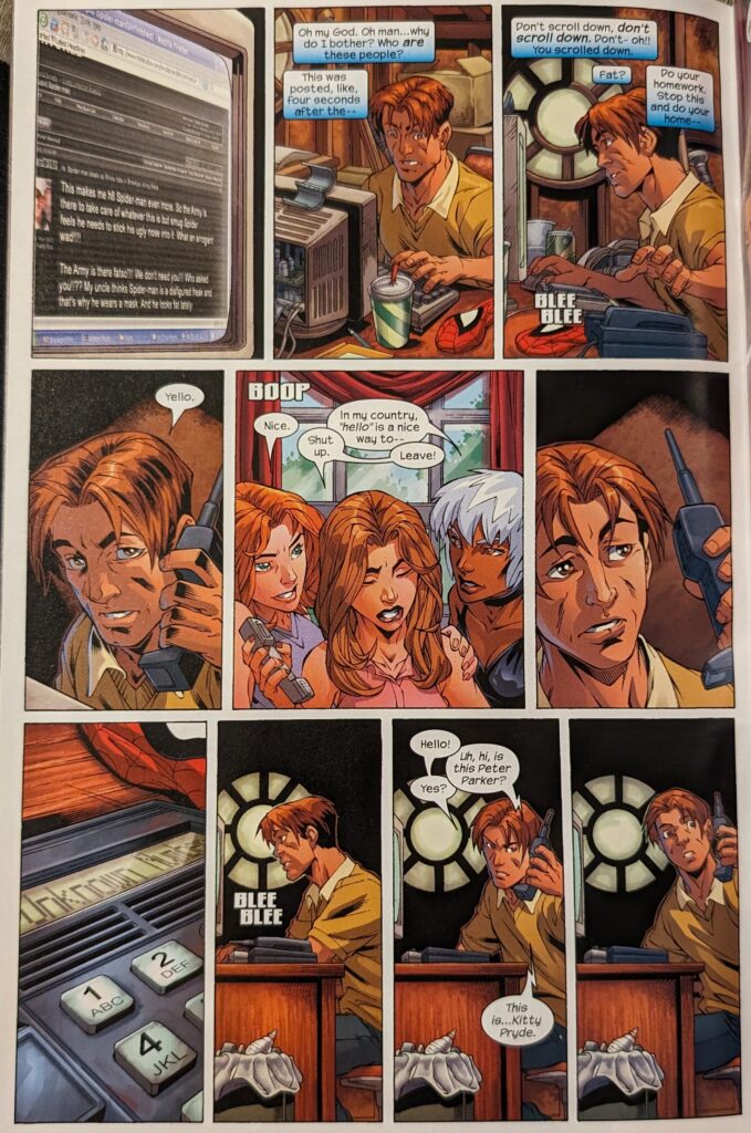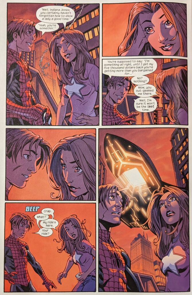 It’s just so funny to me that this “loser” Peter Parker is always hanging out with some pretty girl. From Liz trying to kiss him way back in USM 4 to dating MJ to hanging out with Gwen to this. It’s not really selling his loser-ness, is all I’m saying. Anyway, I can’t remember… Either me or someone else on the forum, when Peter outed himself in Civil War, one of us put that 5th panel in our message board signature. “What kind of selfish evil scum would I be,” indeed. Still makes me laugh. Peter catches himself and doesn’t want to be complaining about MJ, but Kitty really wants to know, so he explains before asking about her, so she can talk about splitting with Iceman. Except she has it worse because they still live in the same building. Then Flash throws something at them, and Kitty asks if they can go somewhere Flash isn’t. So, Peter takes her up on a roof… somewhere. The Bugle? Where they can see the Triskelion, and they bond over not liking Nick Fury, and then Kitty just comes out and asks if he literally can’t date anyone, or if a mutant who could take care of herself counts. Then she gets embarrassed and phases through the floor to run away.
