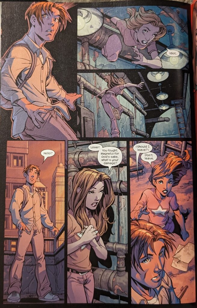 Like, he defeated Rhino more or less the same way as in the PS2 game, but he’s seemingly doing it for the first time. Back up in Westchester, a sullen Kitty Pryde is thinking she’s the loser of her school, the only one who doesn’t fit in while bemoaning the end of her relationship with Iceman, as back in Queens, Peter Parker is thinking he’s the loser of the school, the only one who doesn’t fit, while bemoaning the end of his relationship with Mary Jane. Laying it on a bit thick! Back at the mansion, Jean Grey comes to see her moping friend, and reads her mind that she wants to see “him.” Jean says Kitty doesn’t even know him, Kitty says she loves him. She just wants to talk to him.