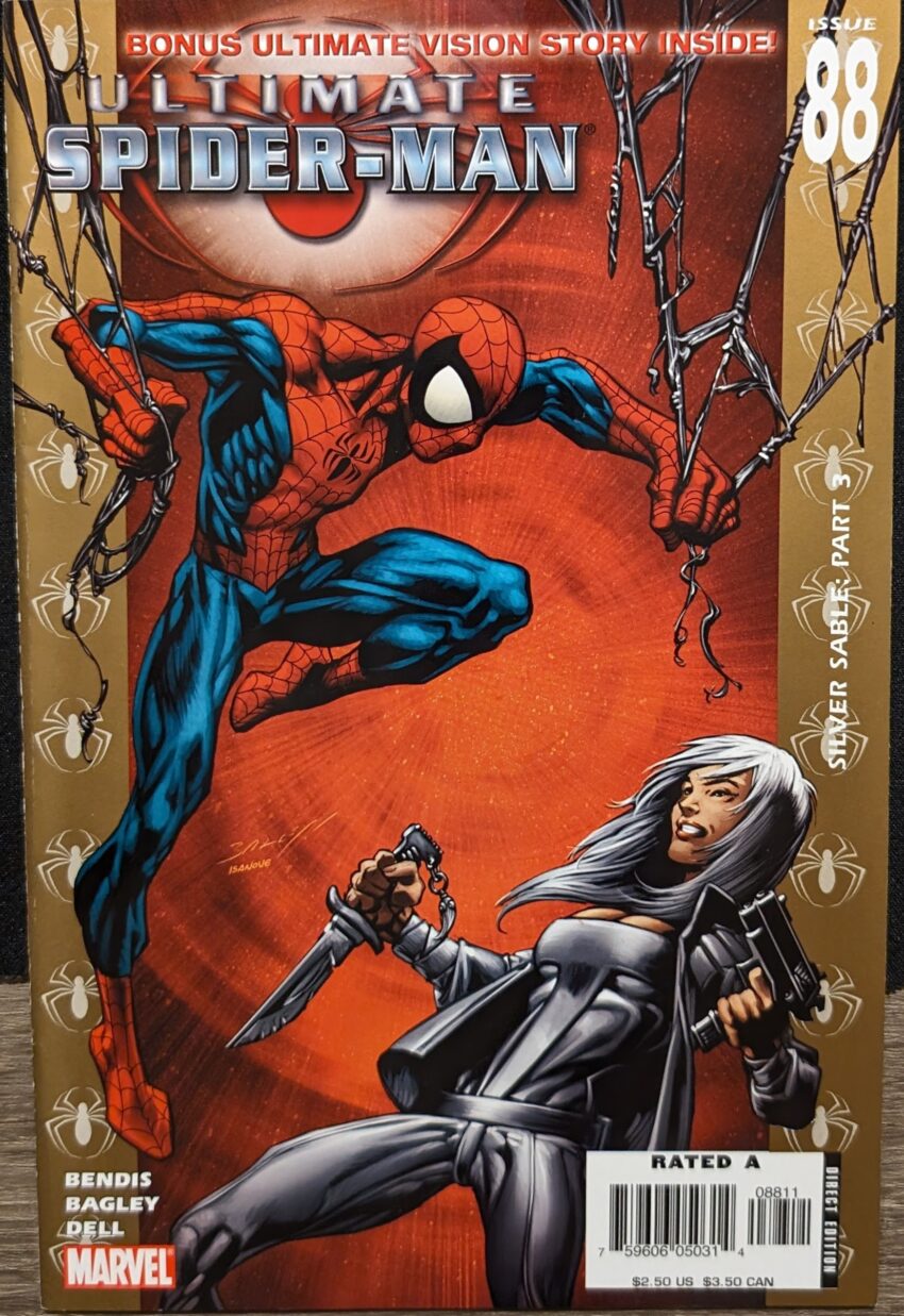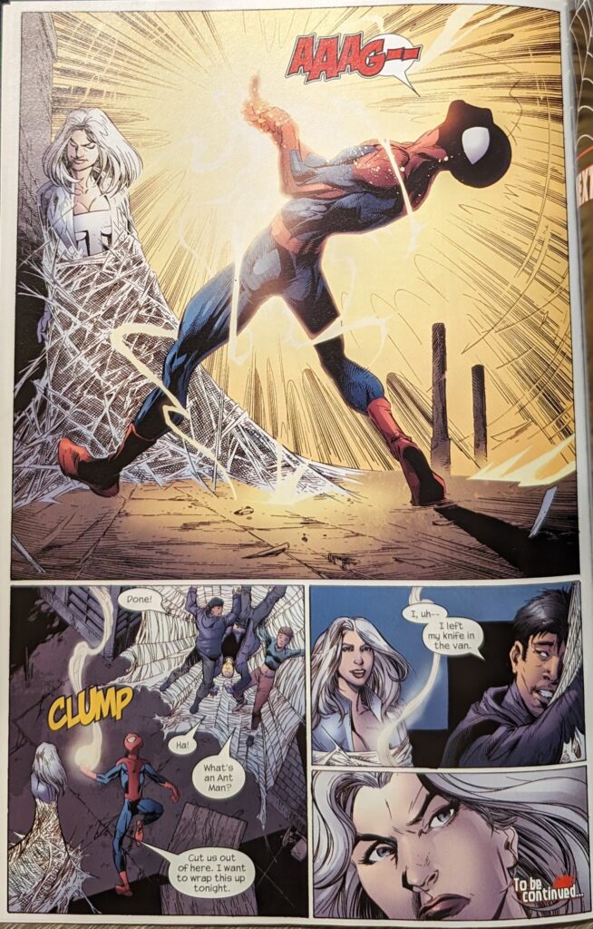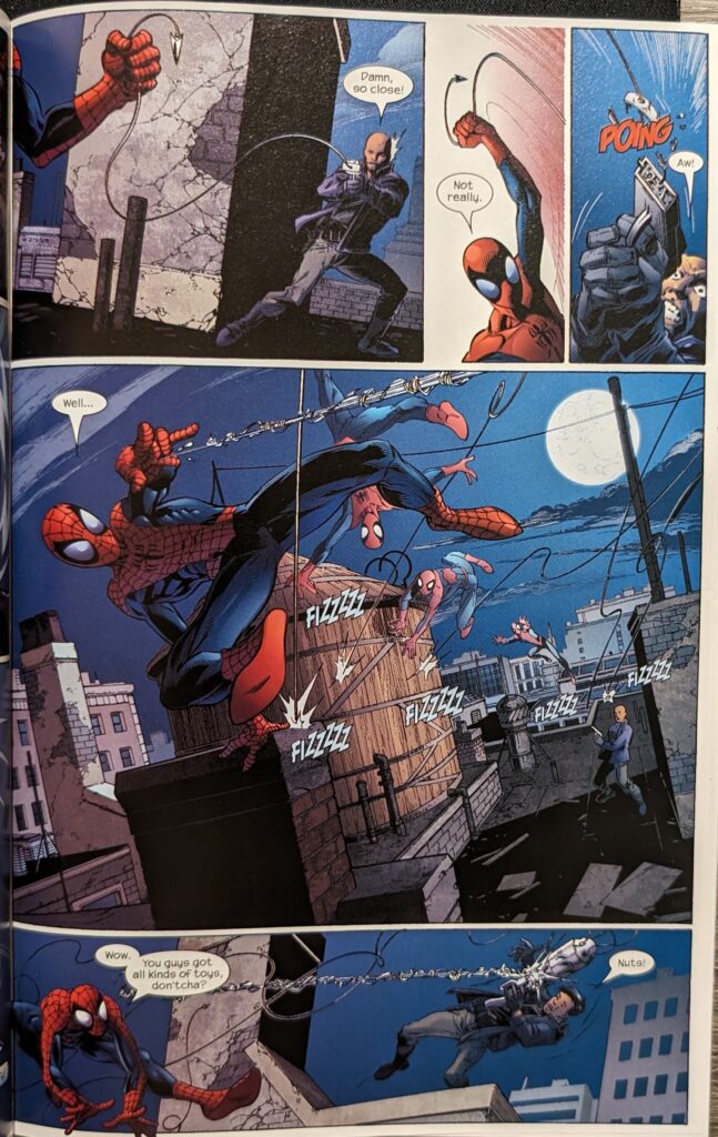 Over a couple of frenetic Bagley pages, the kind of fight scenes I was missing, Spidey easily handles all of Sable’s Wild Pack, throwing them all one by one into a big web, joking the whole time about how they’re so beneath him that it’s embarrassing to be seen fighting them, “And I’ve fought Kraven the Hunter.” Get im.