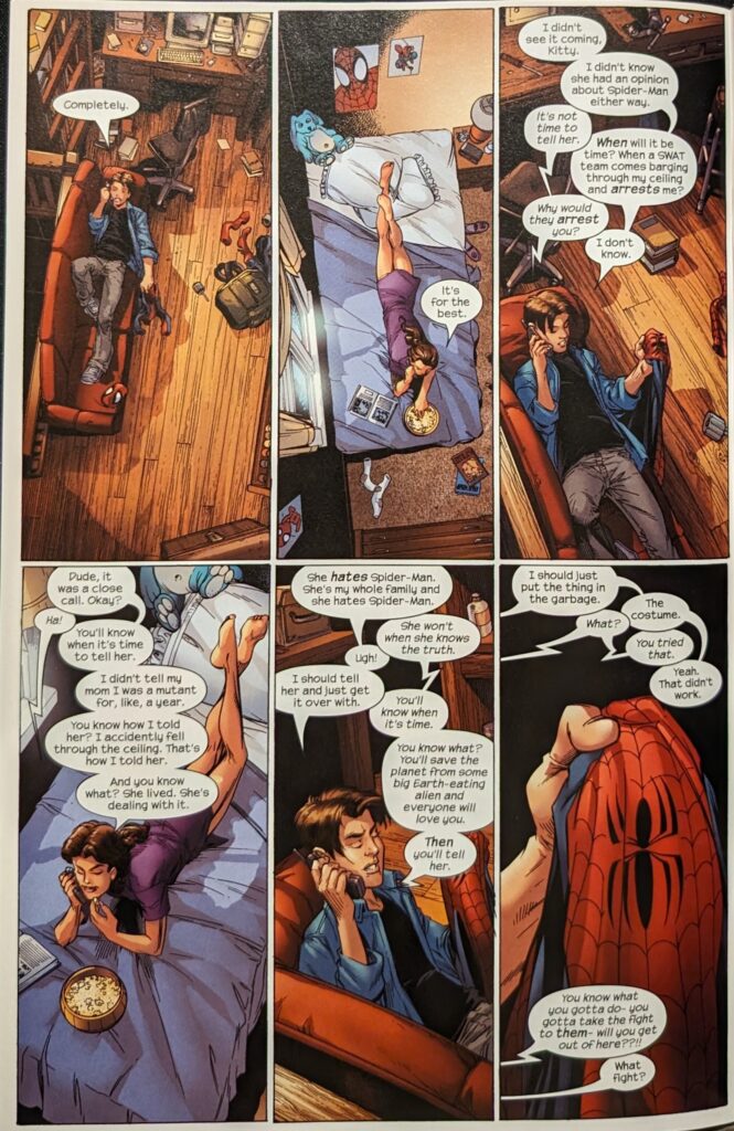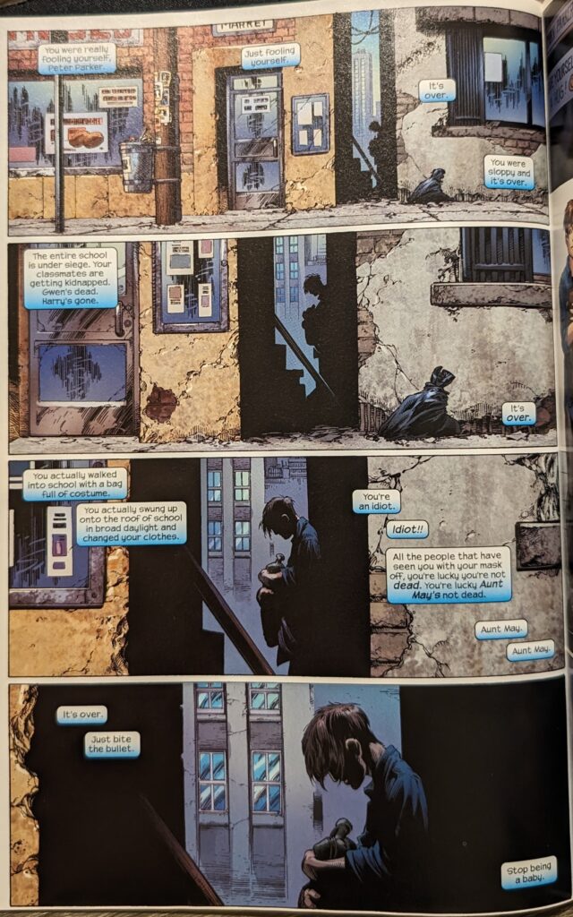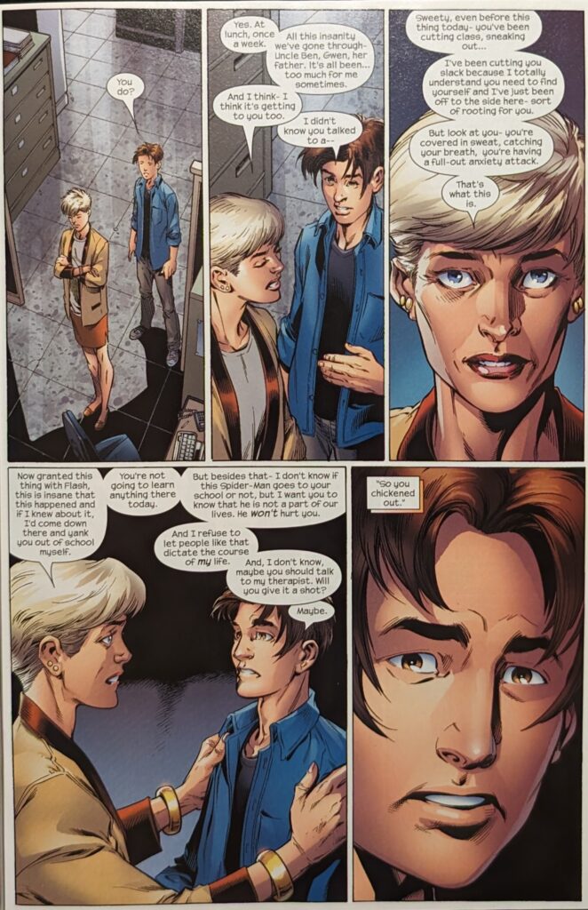 And you know, May’s offbase, but look at her looking out for her boy. Bendis & Bags have her simultaneously making him more terrified than ever of her finding out he’s Spider-Man while she earnestly, honestly tries to support him and make him feel better. I mean, how good is that? When these boys were cooking, you could not beat them, and that was most of the time!