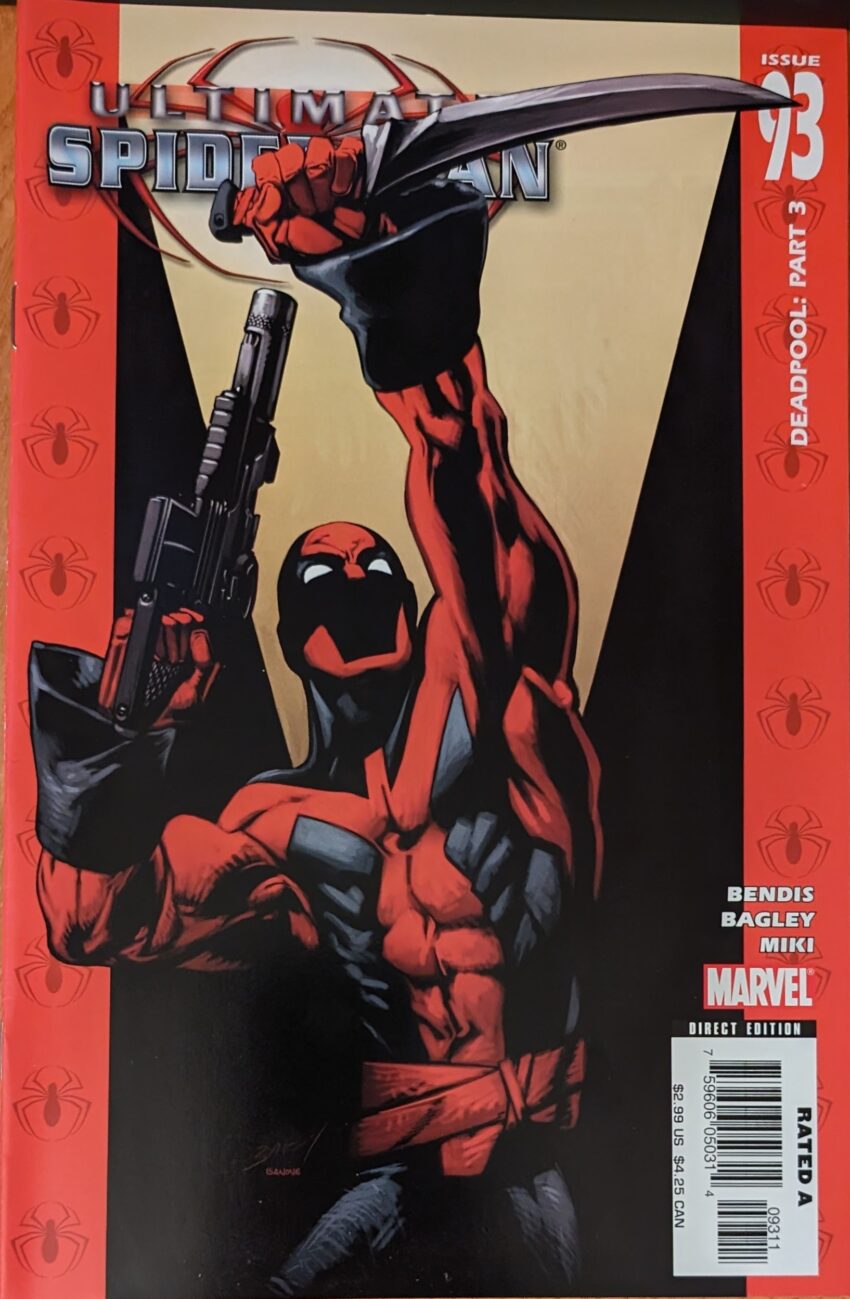 Why Bendis went with “Wadey Wilson” is beyond my ken, but here we see the only thing I remember about this story, “no backs.” People all over the comics internet were baffled by this phrase. What does it mean? Is it a typo? Bendis said it’s a thing people say. No one believed him. And, you know, in the intervening years, I actually have heard the phrase “no backsies.” But never “no backs.” We’re all fronts around here. We continue with 2-page spreads with a big group shot for half and “Wadey” on TV, talking like a really incongruous cross between a surfer bro and a TV cartoon southern racist as he extols the virtues of his gang, the genetic abominations of their opponents, and lies about the X-Men being caught in international waters so as not to break any laws. And, crucially, not being funny. Even, like, “it’s supposed to be funny, it just isn’t.” Bendis has disregarded basically everything about Deadpool. Which, in most cases, I would expect to be an improvement, but this guy doesn’t really have much going for him. Pre-taped Deadpool continues his racist tirade as live Deadpool fights Nightcrawler, telling him he should’ve listened to Cyclops and run away.