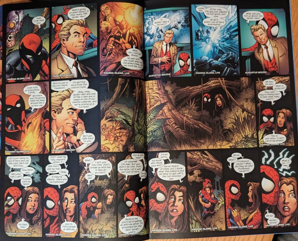 I just want to know what voice Bendis heard in his head writing this for “Wadey,” because to me, it’s almost like a different voice every individual panel. Spidey saves Kitty from a huge explosion as the camera moves around the island, getting a chance to see Cyclops blast a bunch of the goons and yell at them. But then Deadpool punches him in the face so hard his visor comes off, and then a helicopter goon trying to shoot Angel gets his chopper stolen by Nightcrawler. The baddies blow it up, but he gets away. Then there’s a segment on the show giving background on Spider-Man and speculating about whether he’s a mutant, then more of them spying on him & Kitty, except they see the camera this time, and Spider-Man kinda freaks out.