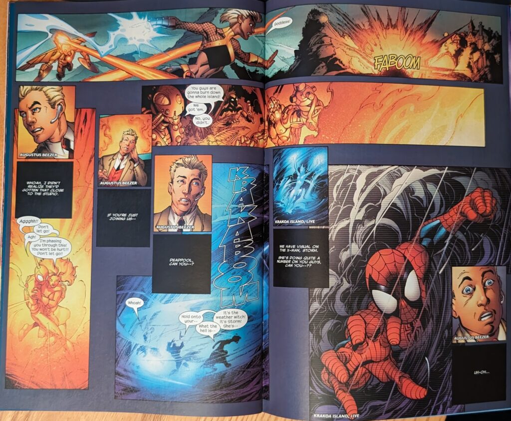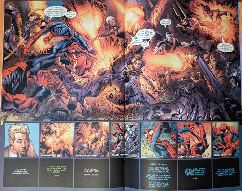 Richard Isanove colors this one solo. This one opens on a 2-page splash of the host of Krakoa Island showing clips from the X-Men story that preceded this one (The excellent Stuart Immonen, presiding), to get us into the right mindset. The host’s name is “Augustus Beezer.” Around this time, Marvel was having a surprise minor hit with a little kid character named Gus Beezer teaming up with various superheroes, so that is a really hilarious joke in 2006. I feel like trotting out my usual complaint that any story with the X-Men in it is an X-Men story. This is an X-Men story guest-starring Spider-Man. In a Spider-Man comic. You never see the X-Men get pulled into a fight with someone else’s bad guys or whatever. The X-Men are a black hole that pulls in other properties.