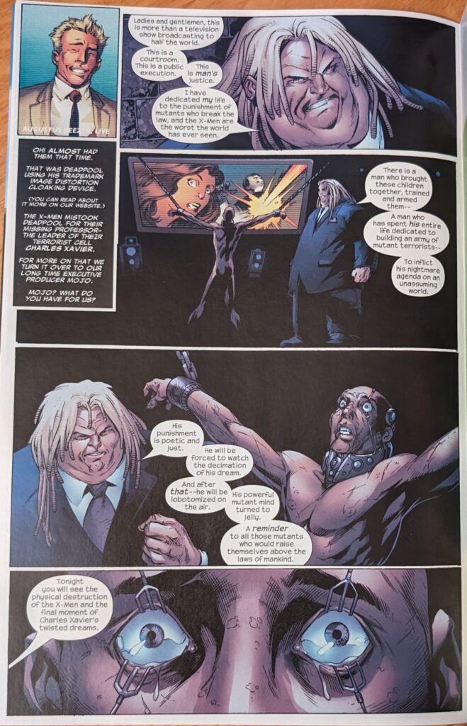 She’s fine, she can phase her & Spidey through the explosion. Well, that’s it for ol’ Wadey Wilson. He died as he lived: Kind of inexplicable and unsatisfying. Cyclops shows up and zaps the remaining Reavers and then the heroes rally and whup ‘em as Augustus panics on TV.