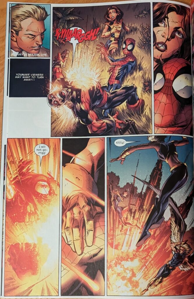 Mojo, as you may know, is the head of an interdimensional television studio that kidnaps the X-Men every Thursday in the main comics, but Ultimate comics are far too “grounded” for all that, so he’s… Kingpin in a wig that would make sure he was never asked back to host Saturday Night Live. Well, anyway, our heroes are regrouping, having somehow escaped the baddies, and they can’t find Cyclops. Deadpool is quickly developing a vendetta especially against Spider-Man for being an unexpected complication, presumably to justify this X-Men story happening in USM. Thus, when the Reavers do catch sight of our heroes again, it’s Spider-Man who gets a huge laser blast from a distance.