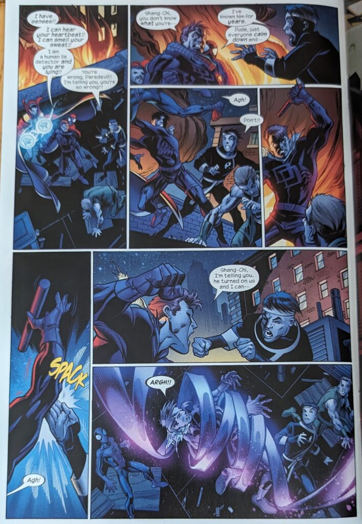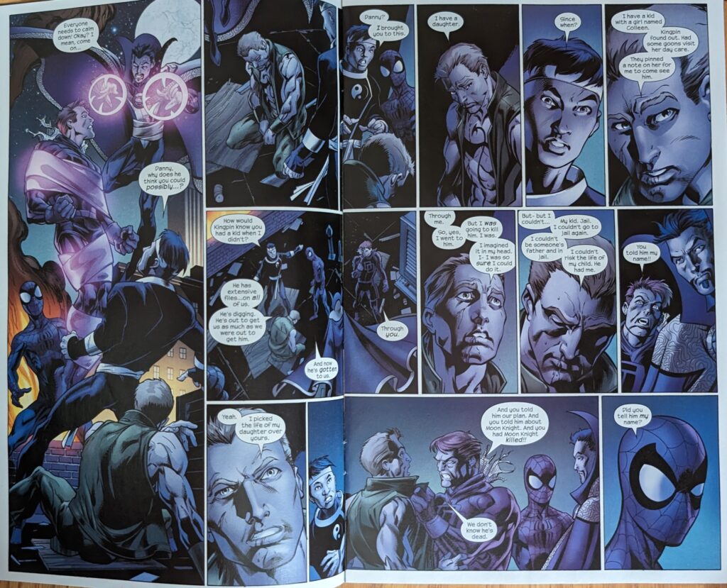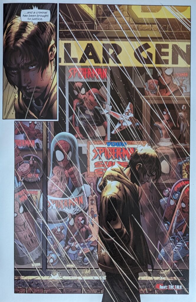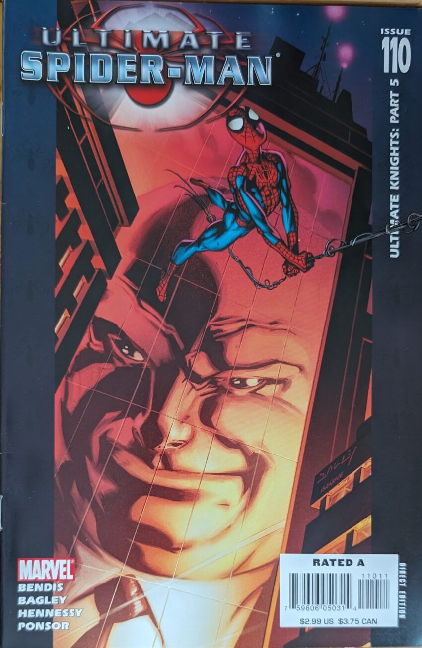 And there it ends. Pretty cool end to this story. Bendis’ cinematic instincts expertly translated by Bags. 110 issues later, as sympatico as they’ve ever been. But nothing lasts forever, and this is Bags’ last (full) issue of USM. He’s actually not quite gone yet, but I’m saving that for next time. What an achievement, tho. By giving Ultimate Peter Parker 110 issues by the same writer and artist, they’ve made him the most developed, most consistent, most “real” superhero there’s ever been. He’s a character readers can really feel like they know. I definitely felt an attachment to him that I’d never experienced with a fictional character. 110 issues! A frankly mindboggling 110 issues in less than 7 years. A regular comic would’ve released #80 this month. And, sure, a writer can churn out scripts that fast, but not just any artist could deliver, time after time, for 110 issues. Bagley really made his mark here. If his long association with Spider-Man on ASM didn’t solidify him as one of the all-timers, this sure did. Ultimate Spider-Man is a truly special project for a lot of reasons, but these 2 plugging away for this long is #1. And Bendis got so lucky in being assigned Bagley. Few artists have the aptitude for both the real human drama and the crazy superhero action this title has demanded. But, guess what? His successor does, too! As much as I’m sad to see Bags go (again, the 2nd time), I’m excited to get into the artist who will debut in the next block. But… the magic is over. Bags’ successor is here for 22 issues, and then there’s a different artist. And then another. With a 2-issue guest stint by another. Etc. And they’re all great artists (Although I have gone on record that I think the 2-issue guest was a mismatch for the title). All very talented. But we were spoiled by the consistency of the Bendis & Bagley team, and we shall not see its like again.