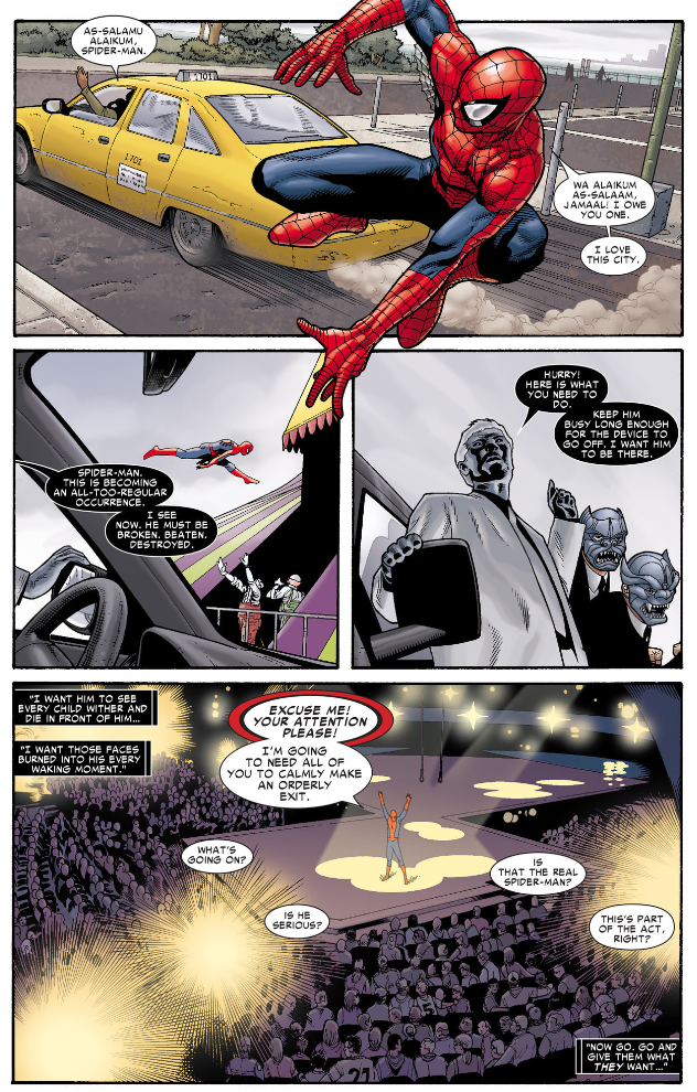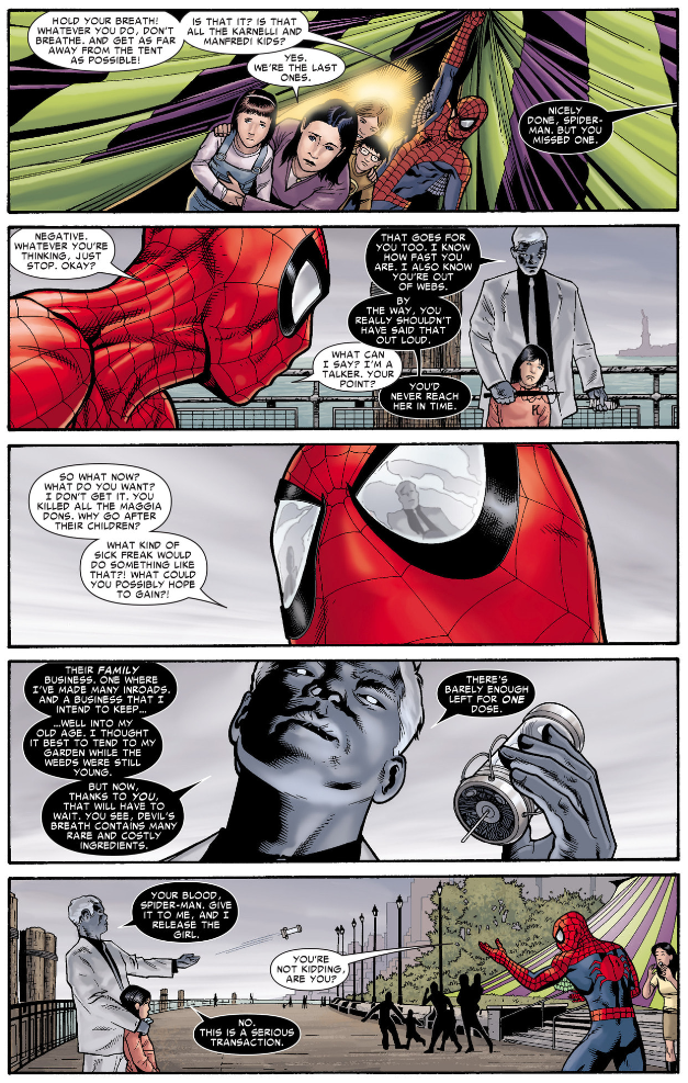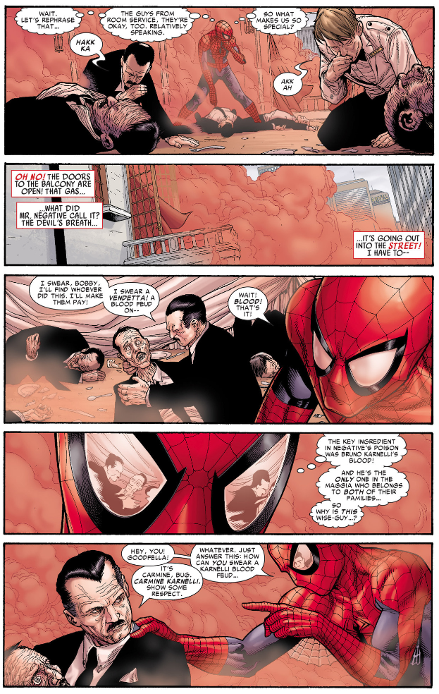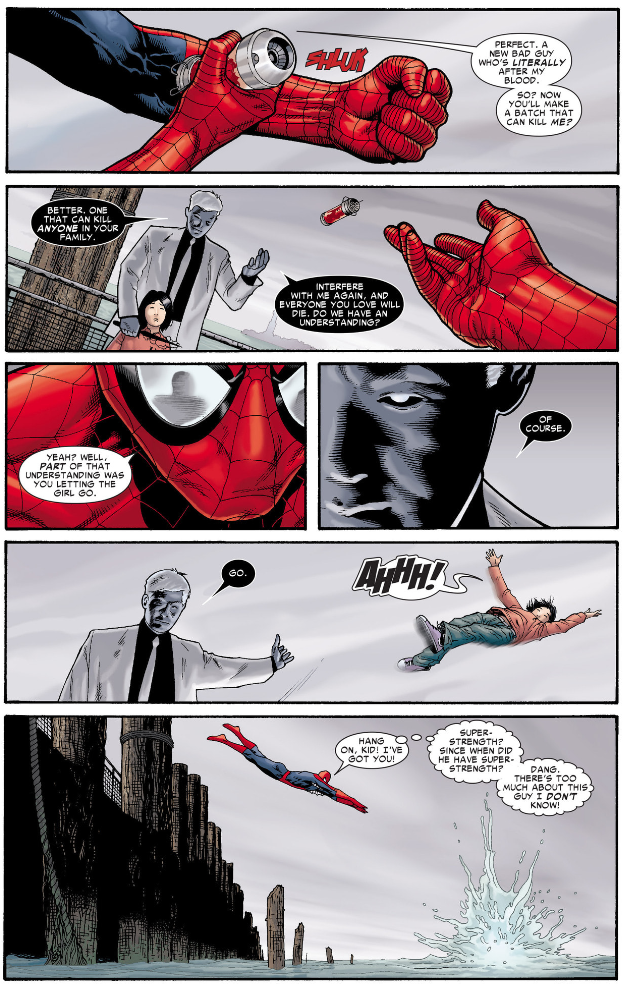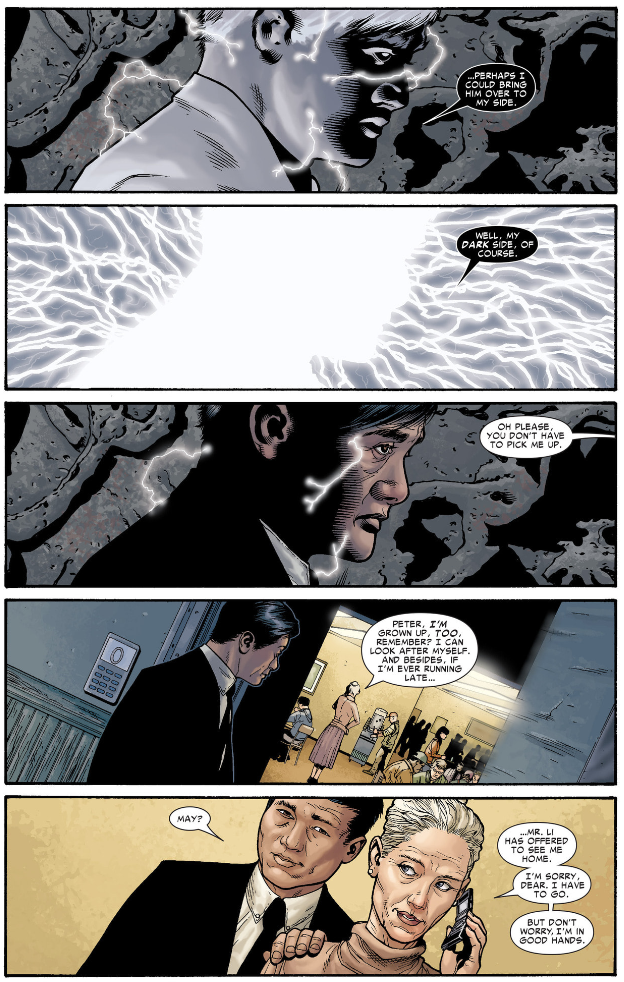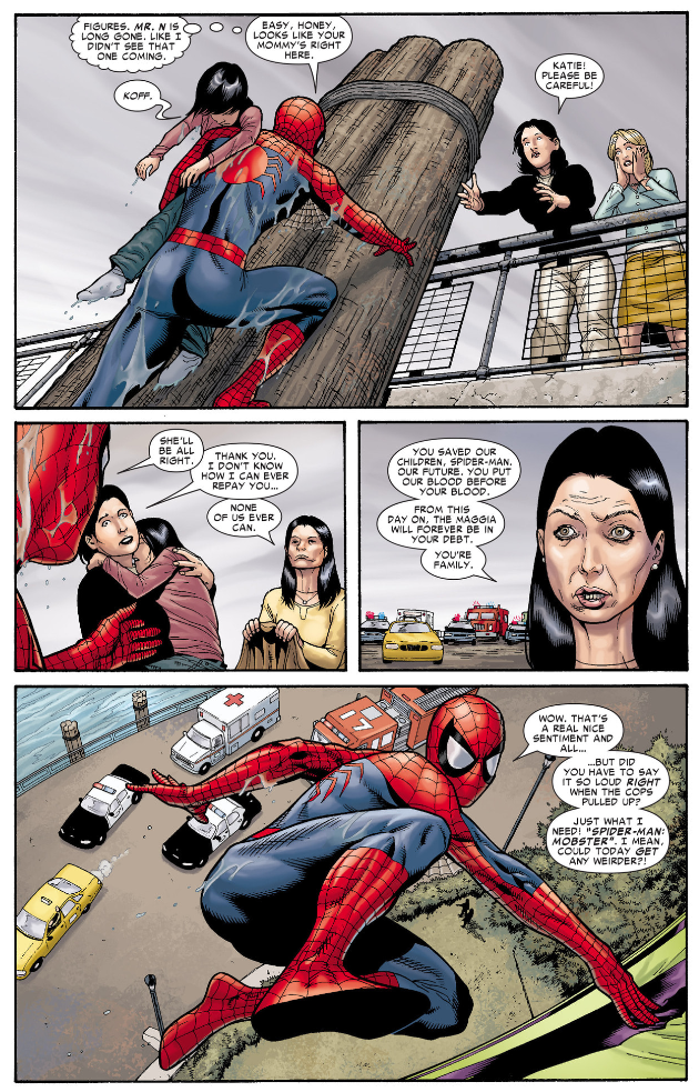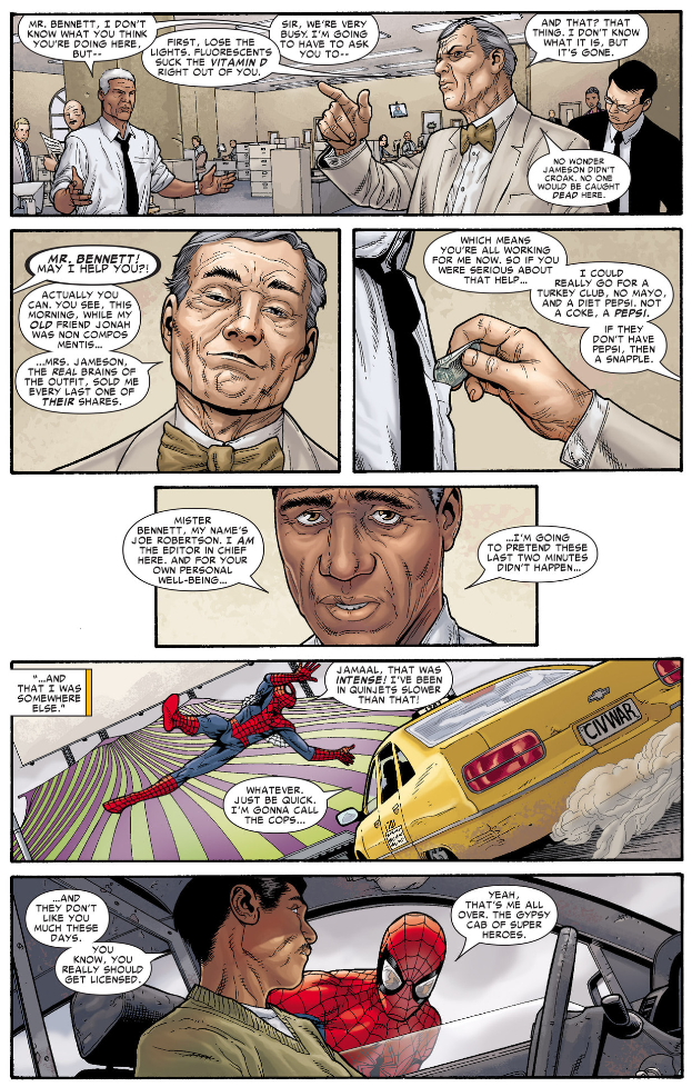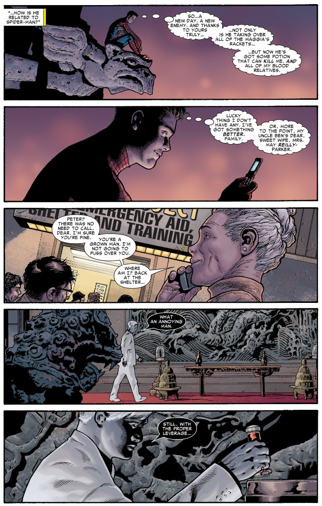 All beef with creative directions and/or personnel aside, a Spider-Man comic with a large cast and actual subplots again is a welcome change from the “Peter, MJ, May and that’s it” model under JMS. Love those instantly dated pop culture references.