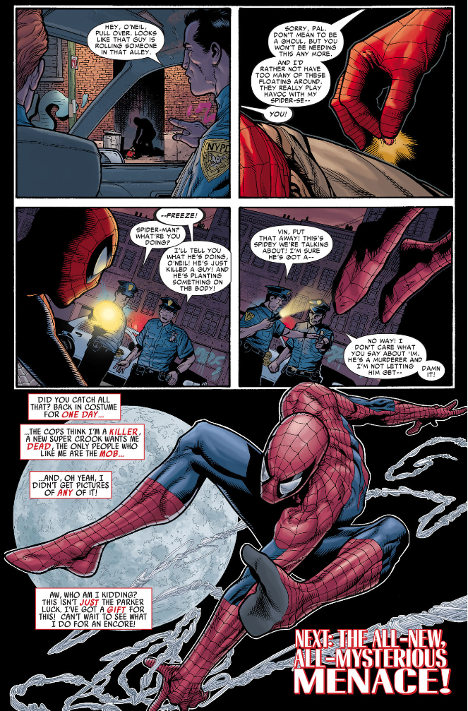 Surprised they revealed that so soon. I know it from being on the internet over the last several decades, but you’d think they’d hold that for awhile. So now they’ve set up Martin Li as a sort of Norman Osborn for their new thing. Cutting back to our guy, his Spider Sense suddenly alerts him to a tracer, which means his Spider-Mugger is nearby. He finds him dead in an alley, still wearing his webshooter, but he arrives just too late to see the fence driving off.