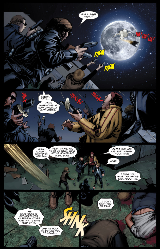 Next up through this era’s revolving door, we have writer Marc Guggenheim, artist Salvador Larocca, and colorist Jason Keith. We saw Larocca on FF, Vol. 3 #9, way back when, but he’s in a different realm now, having fallen prey to the “realism” trend, tracing a lot of celebrities, tracing a lot of things from Google image search. It’s kind of sad, really. Guggenheim we saw doing the recent Blade miniseries. We open on some guys running through the Port Authority Marine Terminal and shooting at someone at night, clearly scared.