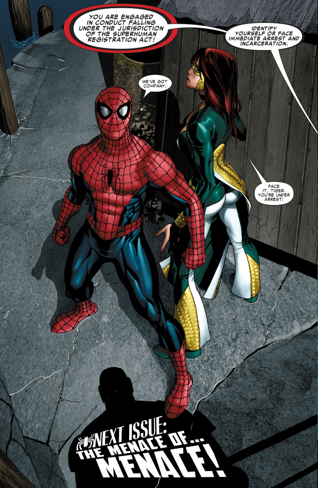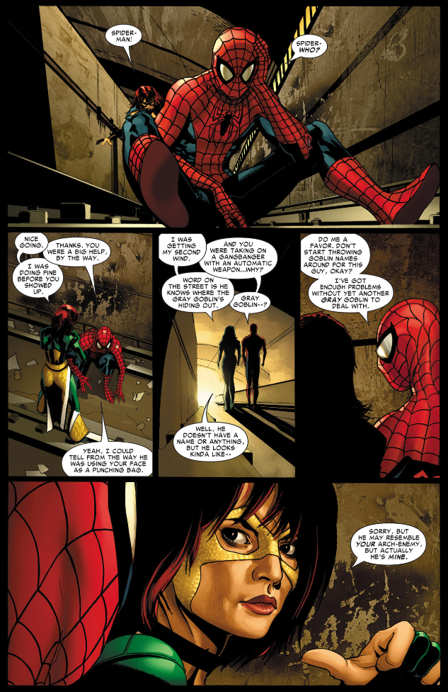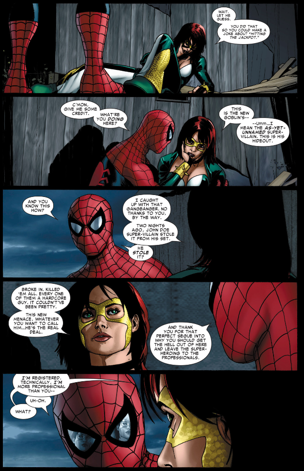 Peter is now with Harry, Lily and Carlie, once again evoking the Peter/Randy/Glory/Jill group of a few years prior. No one thinks MJ is back in town, and the girls make fun of Peter for being stalker-y. Harry says it’s not stalkery to look up a friend, but she’s in LA, not witness protection, and “even those people leave a trail.” This gives Peter an idea, and he leaves. Next, Spider-Man is at “the DB!” (So dumb), where he uses… a device… to… see the exhaust trail of Menace’s glider? How? What device? Larocca chooses a down angle from far away so we can’t see it, and Spidey just thinks “So glad I didn’t throw this baby out.” Ok! fine! Also it’s been, like, half a day, minimum, and you can still follow the exhaust trail? What’s in that stuff? Spider-Man is now at the warehouse Menace commandeered at the top of this issue. He thinks he sees a guard, and just hauls off and punches the blazes out of them without seeing who it is, despite no warning from his Danger Sense. Real good stuff, Guggenheim.