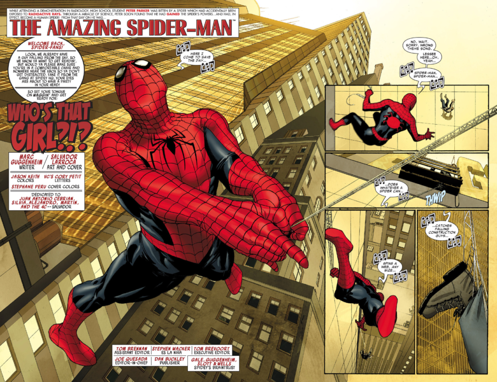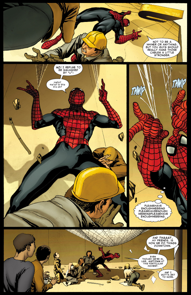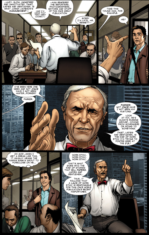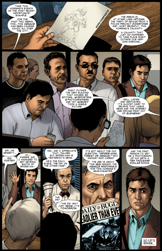 Not too recognizable as the same Larocca from before. He’s drawing the movie suit spider on the chest. Soon, Peter Parker is in “The DB!,” where he learns poor Jack has been laid off. Wait, who’s Jack? Just some guy here to provide some exposition. He was working on a story about a spider tracer found on a dead guy (That sounds familiar), but was told that’s “Daily Bugle, not DB.” Jack says he’ll maybe take his story over to “the Distinguished Competition” and see if they have any interest. Is this some weird reference to Jack Kirby leaving for DC in 1969? I guess it doesn’t matter, we’re off with Peter to a staff meeting.