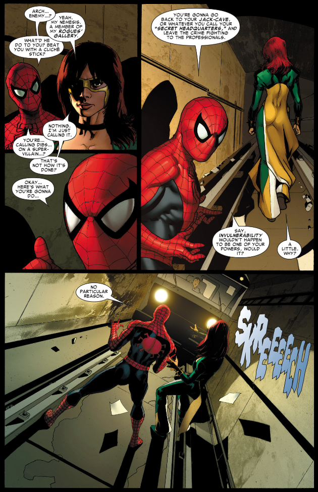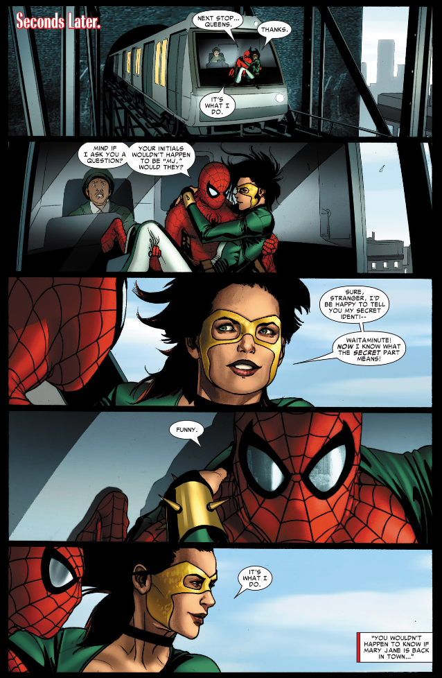 Yes, there’s a new goblin on the block, and his name is Menace. While I wasn’t reading ASM in this period, I know about Menace, and all I can say is, don’t get too excited. Whoever Larocca has chosen to trace pictures of for Peter doesn’t look like Peter Parker to me at all. Soon we find Spider-Man fretting about what seems to be a new goblin, telling us he’s so broke he’s out of webfluid and can’t make more, and worrying about that spider tracer when he hears a scuffle in an alley… and finds Jackpot fighting a mugger. Yeeees, Jackpot, the character who sure looks like MJ and is named after MJ’s catchphrase. Is it really her? They sure want you to think so! Somehow, both she and Spider-Man aren’t able to stop this guy from getting away, AND he runs into the subway faster than they can follow, despite Spider-Man’s ability to leap 30 feet, none of which makes a lick of sense. The guy gets on a subway train, which Spider-Man suddenly remembers he can leap onto, but then his quarry produces a machine gun out of nowhere and Spidey has to leap free to avoid being ventilated.