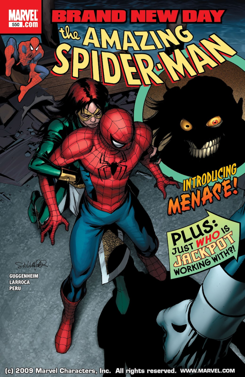 The Flash Thompson gag is pretty good. HOW CAN HE NOT TELL IF THAT’S MJ OR NOT? She just has a gold outline on SOME of her face!! Terrible! I rarely know which celebrities Larocca is tracing. Someone had to tell me the Tony Stark in his long run on Iron Man was a guy from Lost. I didn’t watch Lost. I almost know who Jackpot is in that bottom panel, but it’s not coming to me. However, after Peter makes a very awkward phone call to Lily Hollister to ask if Harry was with her last night…