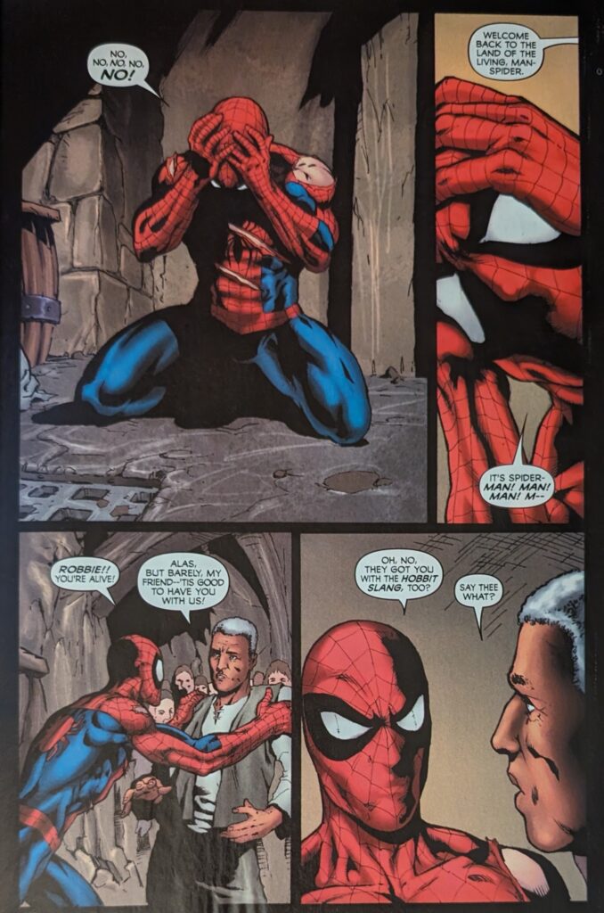 I just read this page 3 times and I don’t understand what’s happening in panel 5. Well, Vermin attacks then, on a his giant rat. He looks like a He-Man character, which is fitting. Robbie uses the confusion to lead people out of the prison as Spidey and Red fight. Sonja severs the chains on the rat’s armor, causing Vermin to lose control. The big rat falls on Spider-Man, and Sonja stabs it in the face for it. Your fault, Red!