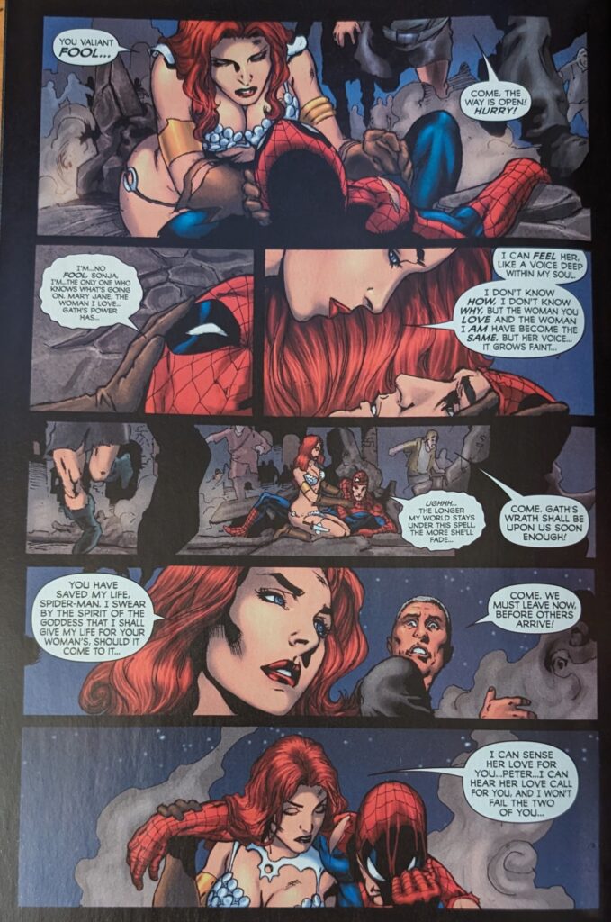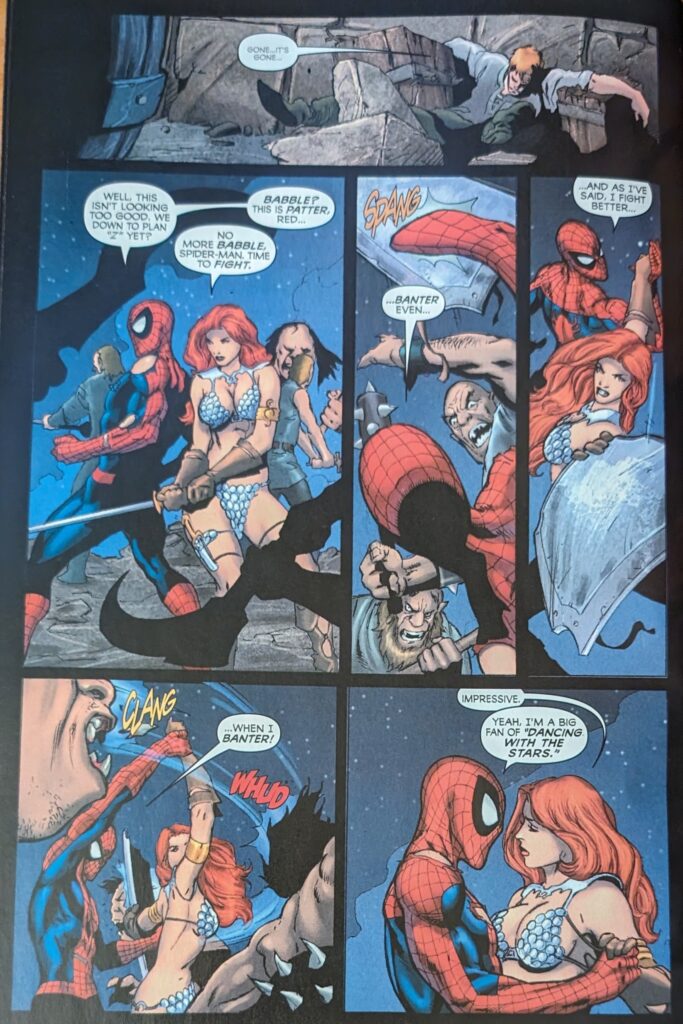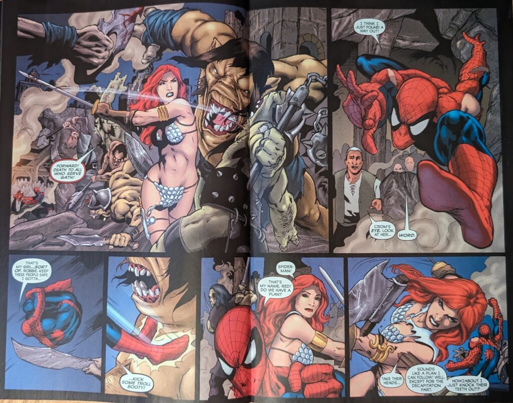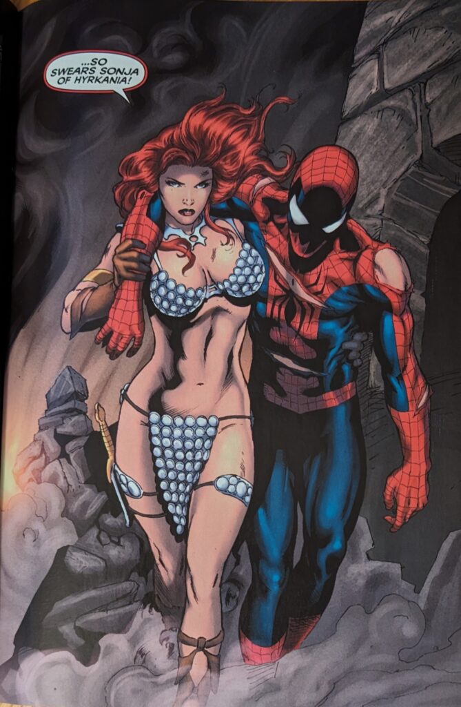 Extremely funny that this issue with that speech came out alongside One More Day part 3. But there’s no rest for the wicked, so now our heroes are randomly attacked by D&D versions of Hobgoblin, Scorpion and the Lizard. Why Hobgoblin and not Green Goblin? Hobby isn’t even active anymore. But that’s the Spider-Man/Red Sonja cliffhanger for this issue. The 2nd cliffhanger is…