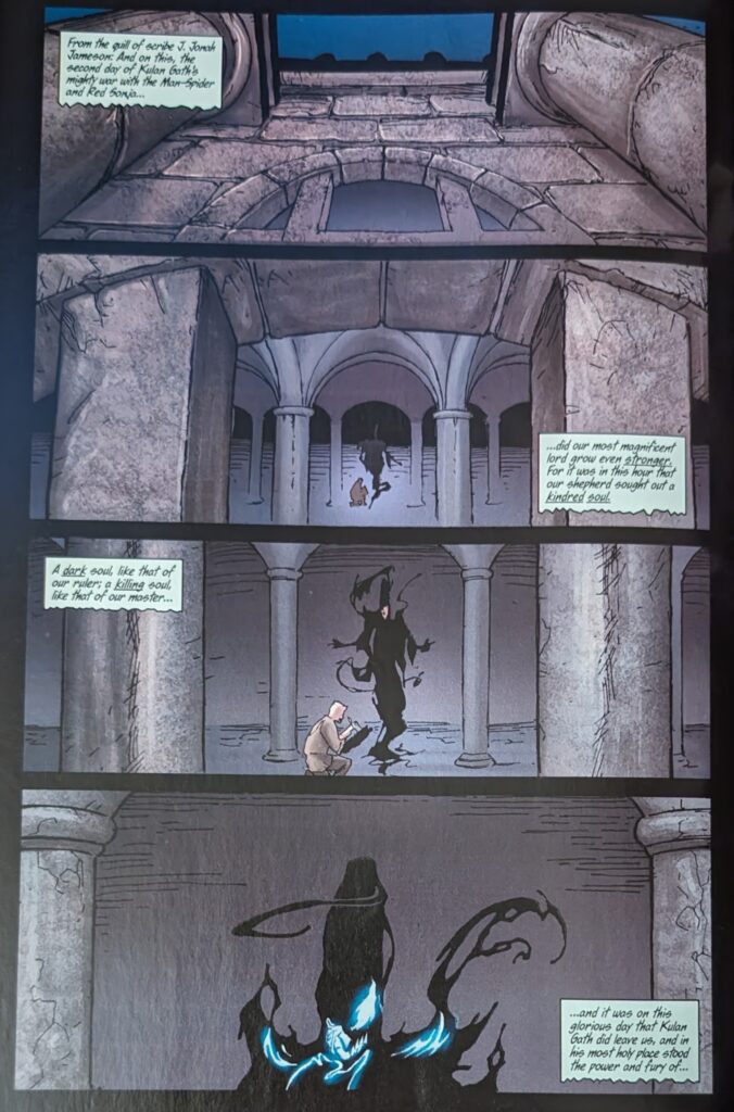 Who knows what’s meant to be happening on this cover? Maybe the inside will explain it, but comics covers are supposed to make you want to see what’s happening in the book, not leave you confused about what’s happening on the cover. Kulan Gath is calling Venom to him, thinking, “His evil is so pure, we compliment each other,” which… doesn’t really feel like a description of Venom. Even at his worst, he’s motivated by his weird sense of justice. He’s not Carnage. But Venom resists when he arrives, so Gath starts magically pulling him apart or something.