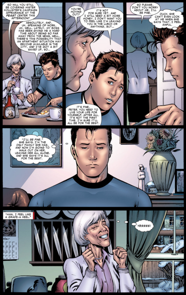 Curt is very old school, also. If I wanted to read 70s comics, I would go back to reading 70s comics. “Damn this one arm!” Get serious, man. Not a great Spider-Man from Kitson, either. Shouldn’t Spider-Man deserve top tier, A-list talent? I mean, again, I’m not trying to be mean, but this title could and should be able to do better. Spider-Man has a phone now, huh? Seems like it would be convenient. Well, Curt tells him if he finds the Freak, he’ll have to kill him. Then he says he doesn’t REALLY mean kill him, but that he’ll have to apply lethal force to make him go into a chrysalis again. He points out that Freaky went into hiberbation due to bullets and fire before, and so is now immune to those (How does he know that???), and recommends suffocation or strangulation. Spider-Man says that goes against everything he stands for. But he knows it literally won’t kill him! That’s stupid. Curt points out he’d be protecting innocent lives, and Spider-Man has no retort. I am so ready for this to be over. Well, our hero heads to the FEAST center to cover the political speech, hoping it’s much more boring than his last one. Meanwhile, this especially wretched take on JJJ comes home…