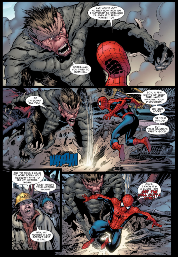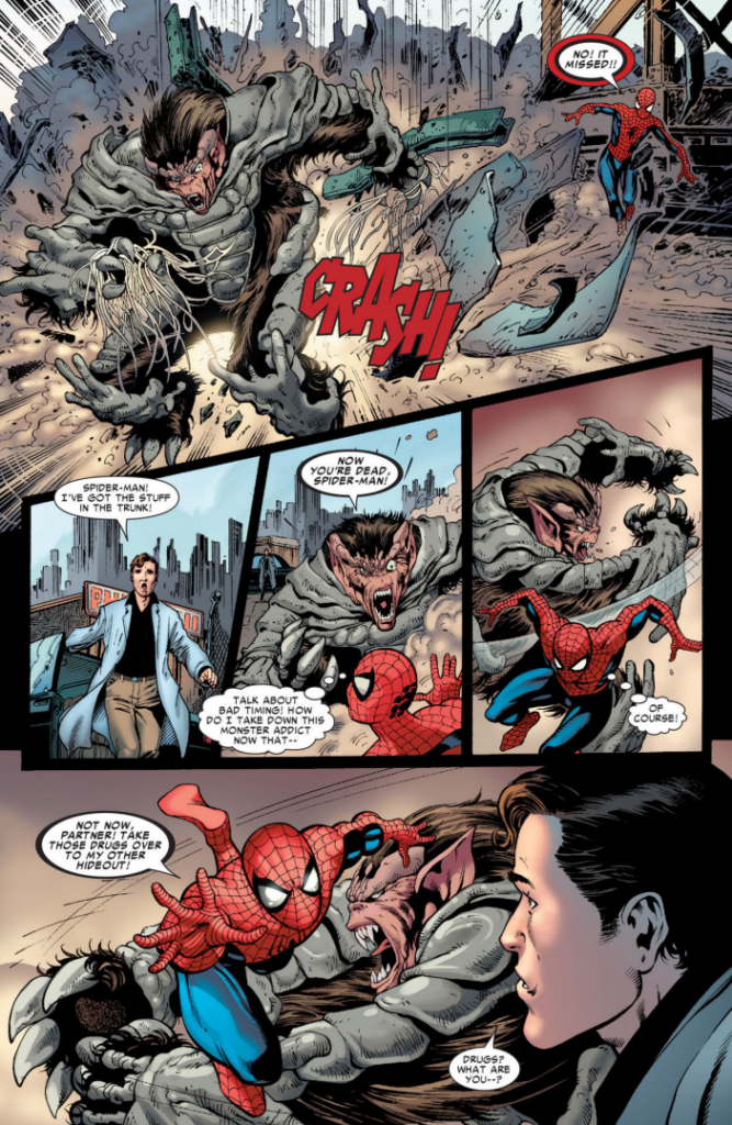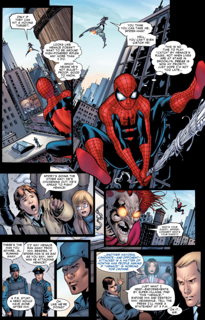 I hate this comic. “Who’s your daddy?” I can’t. I think the Spider-Man-hatin’ cop from this whole run is Vin Gonzales, but I honestly can’t tell by looking at him. He looked basically white a few pages ago, is that really him? Well, our guy gets down to the Brooklyn Salvage Yard JUST in time for Freak to emerge, what luck.