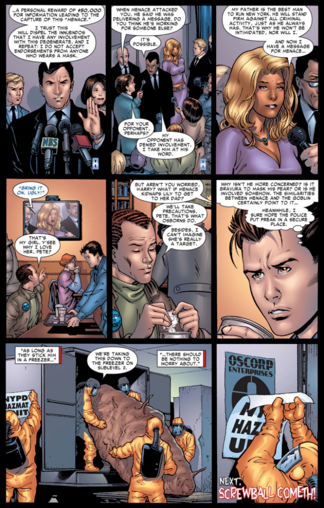 Boy, there’s a lot to unpack there. If Peter’s so suspicious of Harry… why doesn’t he seem worried about him in any previous issues? And why would Oscorp want Freaky? I hope they dissect him and he never comes back, but I can’t imagine I’m that lucky. Screwball, eh? I know her from the Spider-Man video game. She’s pretty annoying in that. Let’s see how she is in comics…
