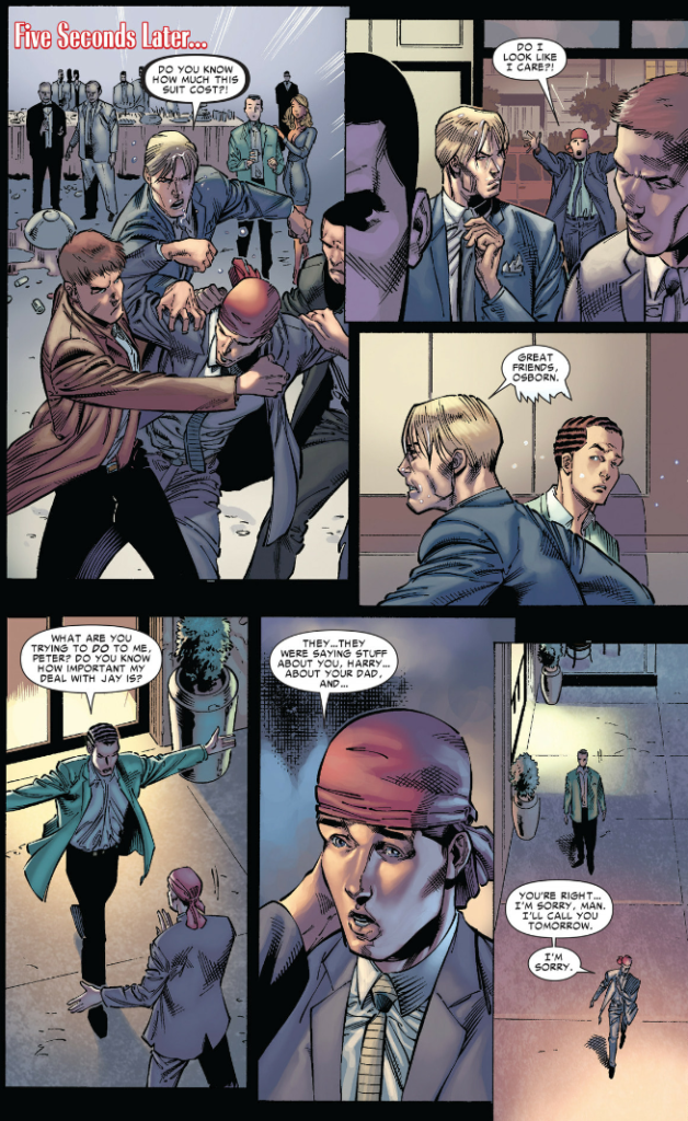 Well, then, Peter is off to try to make it to Harry’s thing, but in an all-new “Parker luck” twist, his mask is glued to his forehead… somehow. It looks like he had glue on him and accidentally touched it to his head. I guess. Anyway, he can’t get it off (And he seems to be pulling with his full strength, which should, if nothing else, handily rip all the skin off his head), so he styles it into a durag and enters the function looking like an idiot. He’s trying! Harry is not impressed, takes it as a sign of disrespect, and, after one of his rich friends makes fun of them…