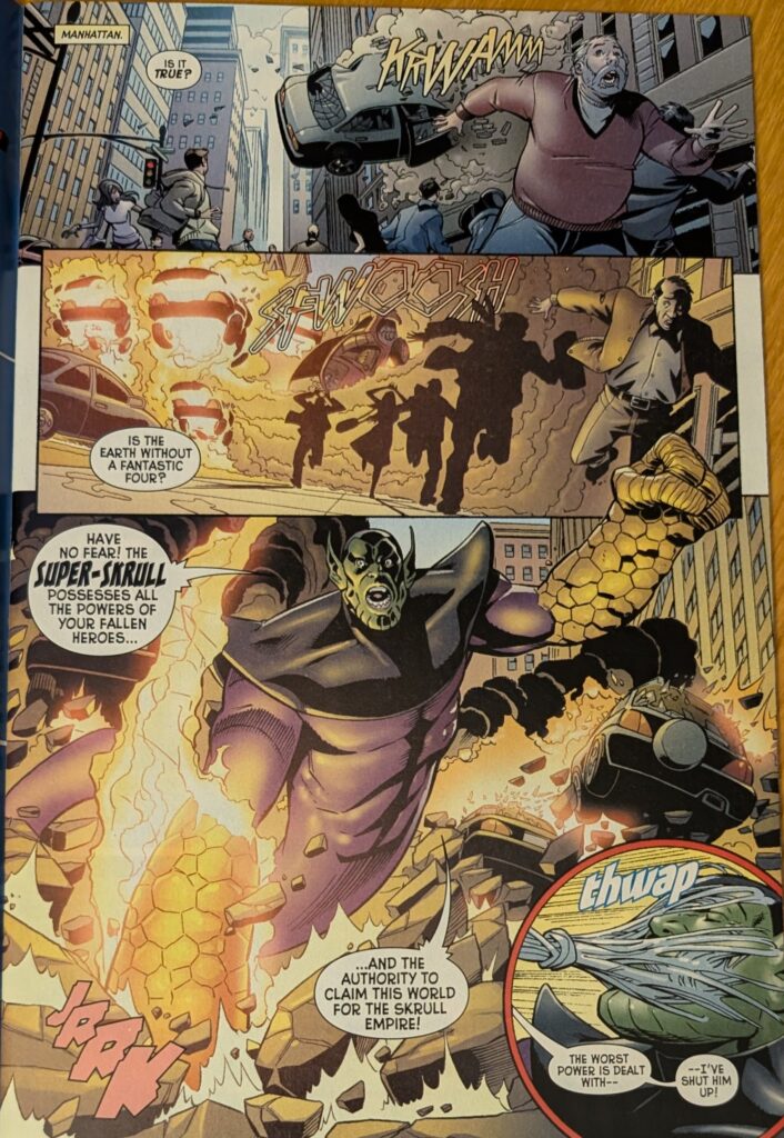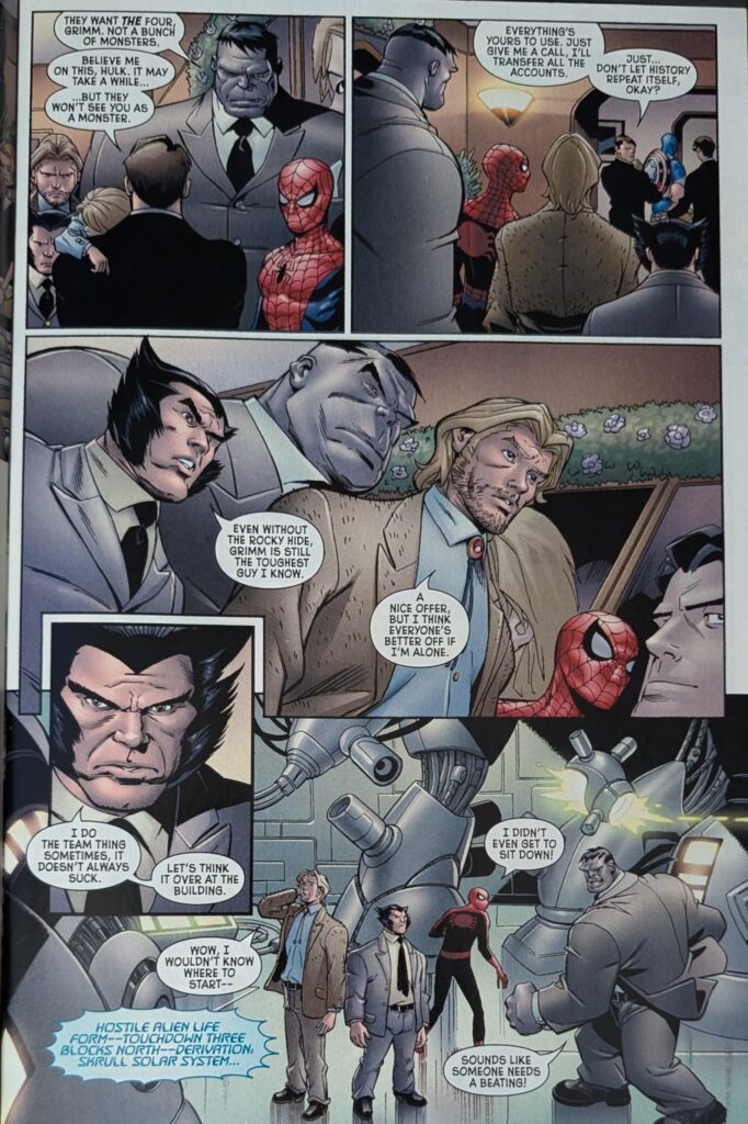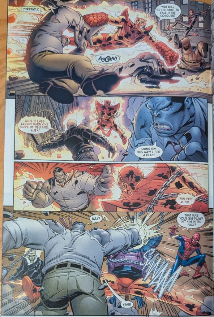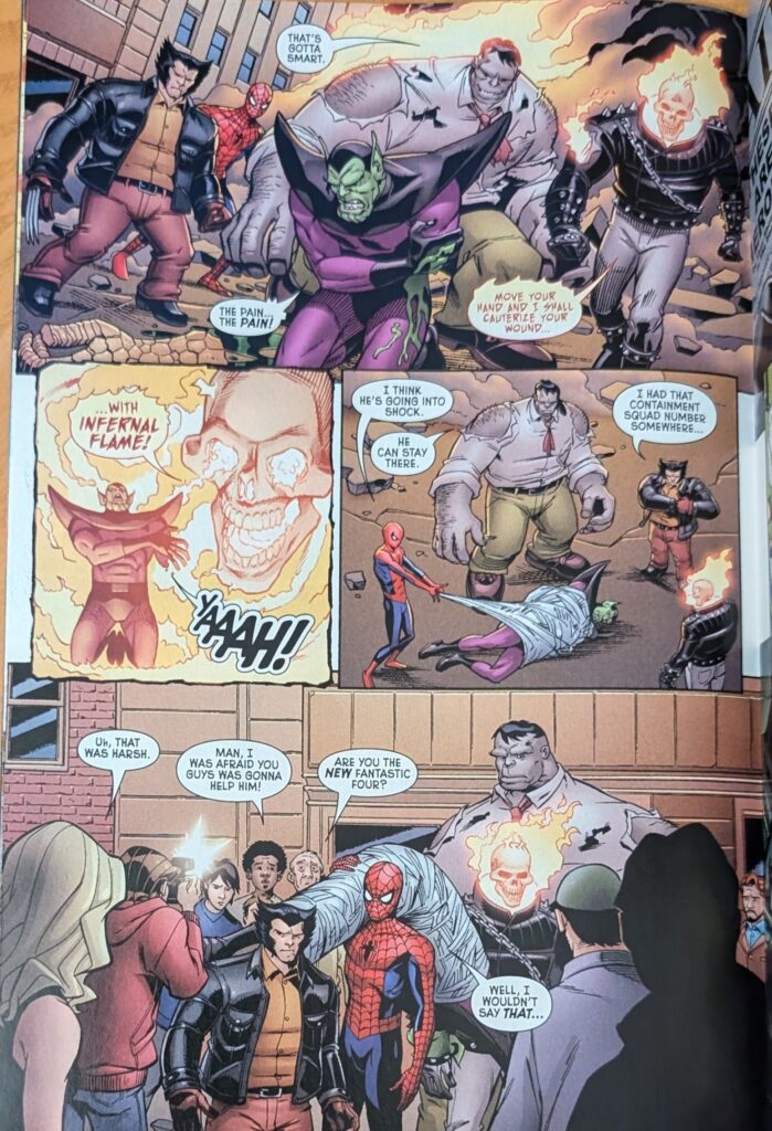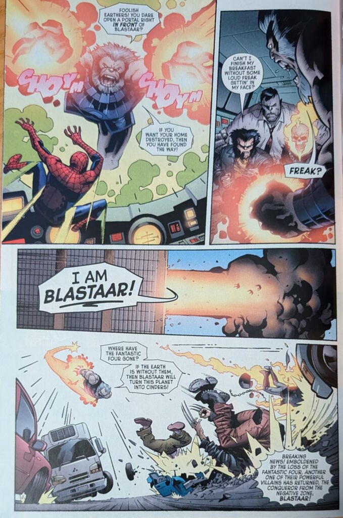 And that, sadly is the last page Mike Wieringo ever drew. He was inked by his longtime collaborator Karl Kesel, who does most of this issue, and colored by Val Staples, who does the whole thing. Art Adams inked himself (And someone else later, which is surprising). On a page by Paul Renaud (I can’t show em all), our heroes see the first Daily Bugle disparaging their efforts, and Ghost Rider once again talks about quitting. And then the Negative Zone portal opens, and we’re treated to 2 pages of Stuart Immonen, inked by Kesel: