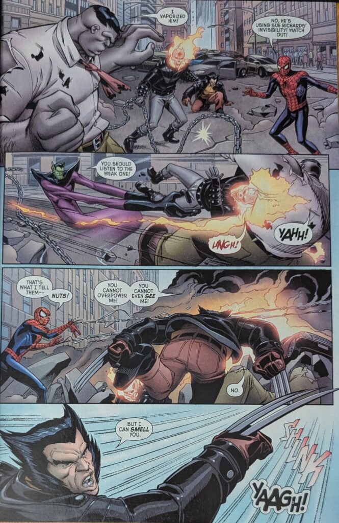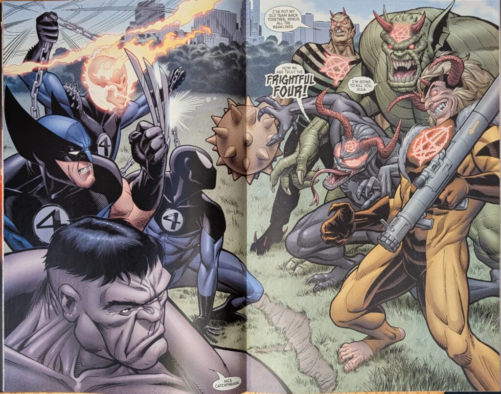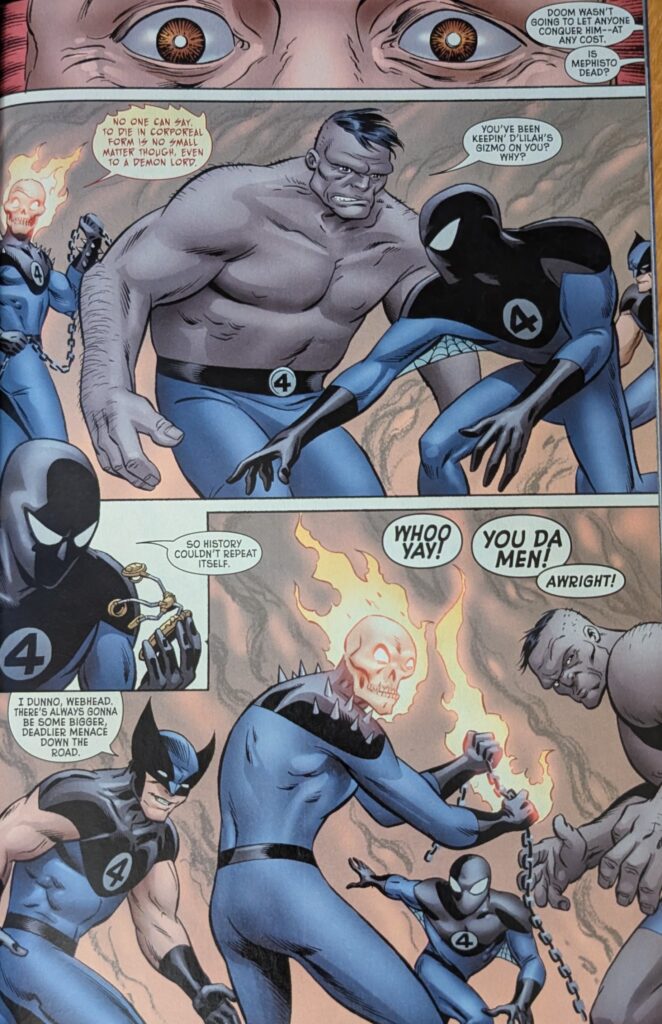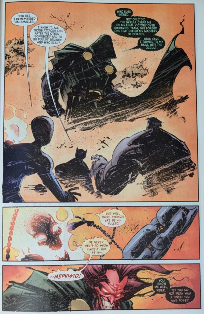 Ghost Rider’s rogues gallery is so lame that the new Frightful Four gives you 2 of Spider-Man’s rather than one of his. On pages by Sanford Greene and Humberto Ramos, the two FFs engage, and a news reporter lets us know the new Frightful Four have created a giant energy pentagram around them, trapping a bunch of people in the fighting zone. But they’re burning out, their demonic gifts using them up, and then they all fade to bones and dust as Doom appears in their midst to do his thing. Skottie Young takes over, inking himself with a very Bill Sienkiewicz flourish.