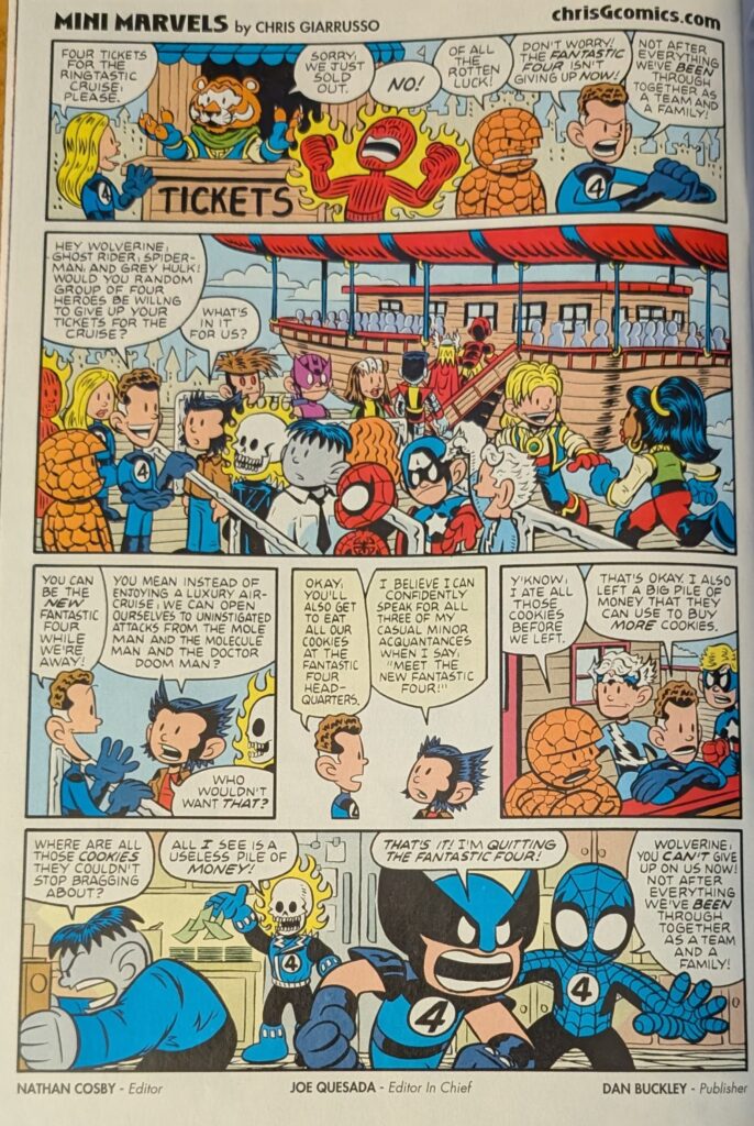 Not the most consequential project for Mike Wieringo to end his career on, but it’s not like that was the plan. Salute to all the guys who pitched in on this. There’s a lot more to the book, tho, including this special edition of Chris Giarrusso’s Mini-Marvels, a feature that ran all through Marvel Comics of the period…