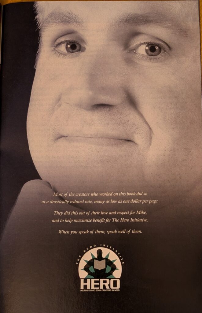 The “most of” on this page kills me. Who were the jerks who demanded their full page rate? I shant hazard a guess. I really shant, none of them seem like they would have. I can think of a bunch of comic book artists I would suspect of such crappiness, but not anyone in the credits here. The rest of the book is tributes to Mike by his brother, friends, fellow artists, and collaborators. It’s very sweet. A nice send off for one of my personal favorite comic artists ever. And on that somber note, we’re leaving the Marvel U for the Ultimate U for awhile. Feels like it’s been ages to me, but it’s finally time to see who will follow Mark Bagley on USM.