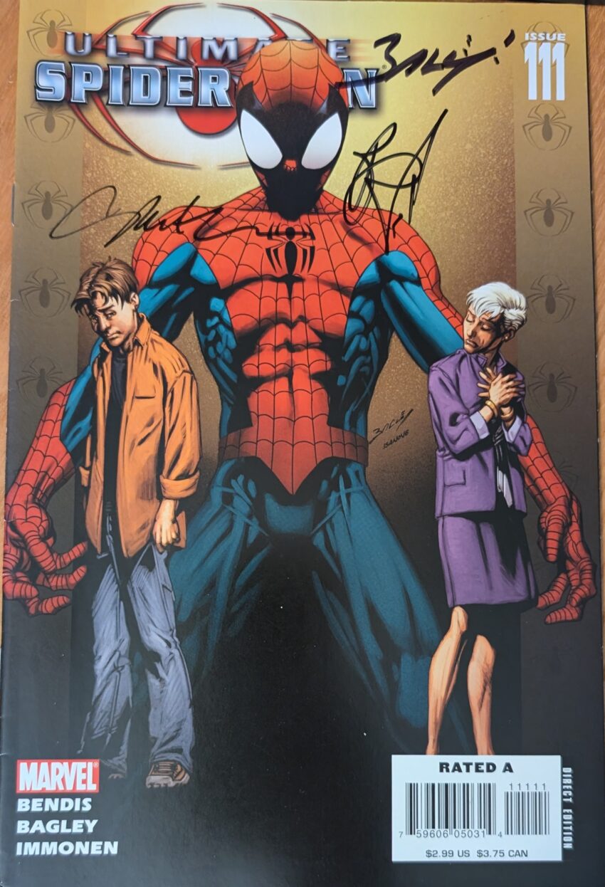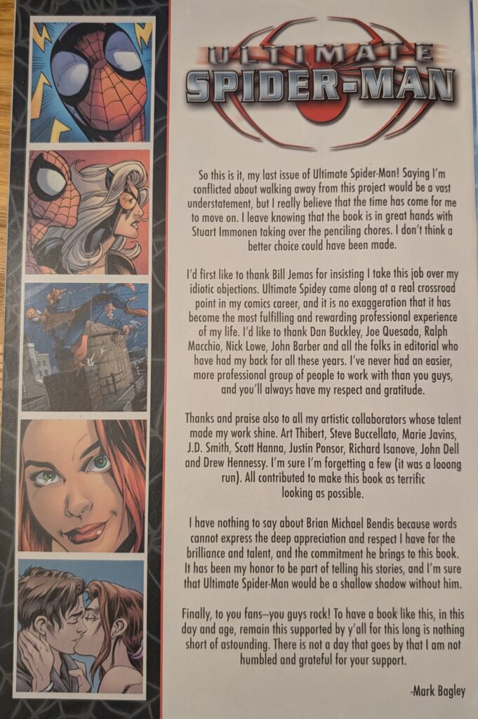 Look at those signatures! I got ‘em all! It took me… I want to say 7 or 8 years, but at various Heroes Cons, I got this issue signed by Bendis, Bagley, and your new USM penciler, Stuart Immonen! Stuart is an inspired choice to take over the title, as he’s got the same well-rounded skill set Bagley has: Superb storytelling, facial expressions and action. But the thing is, Bags isn’t quite gone yet. In a pretty smart move, the outgoing artist passes the torch the new guy in the middle of this issue. The whole thing is inked by Drew Hennessy and colored by Justin Ponsor. So you get one more half an issue of Bagley, and then you get to see what his replacement will be about. In the unusual situation of someone following a 110.5 issue run, I think it was a nice way to ease into the transition. So the thing is, I accidentally read all of Secret Invasion before the last block, wrongly assuming it took place after the event. So then I went back and read that. So, for me, it’s been a really long time since the last USM block. But we’re back, and so is…