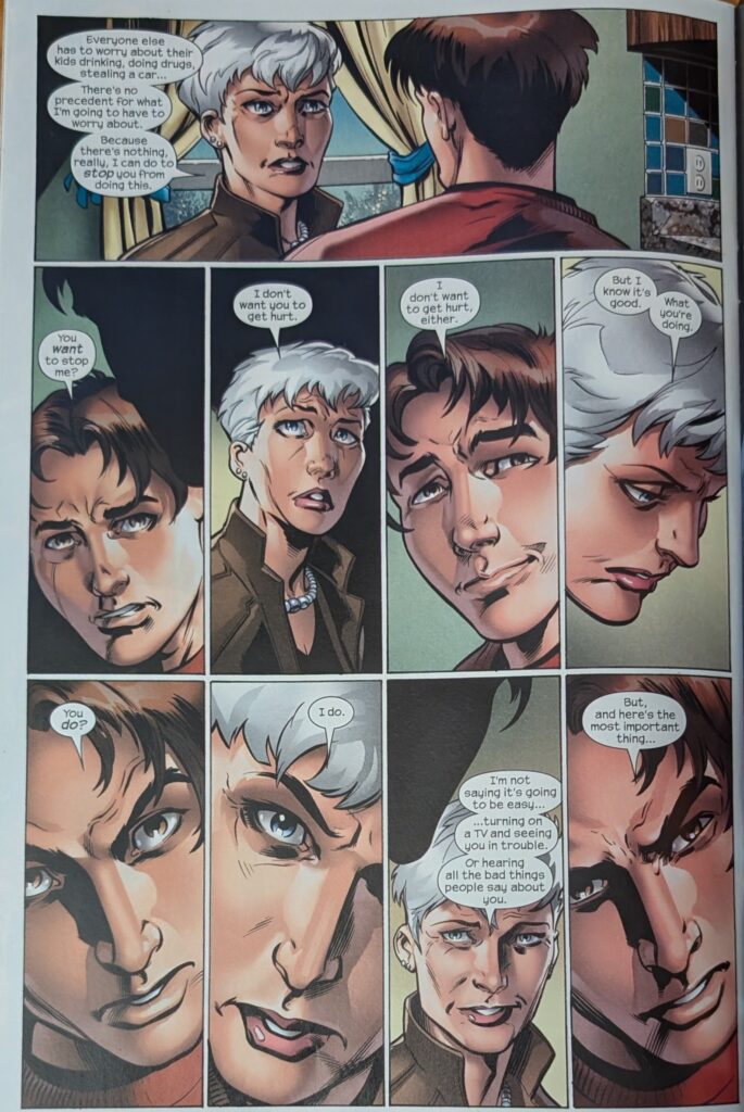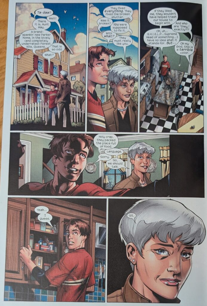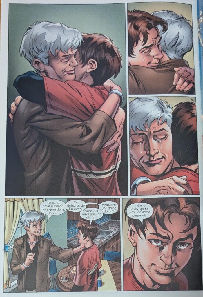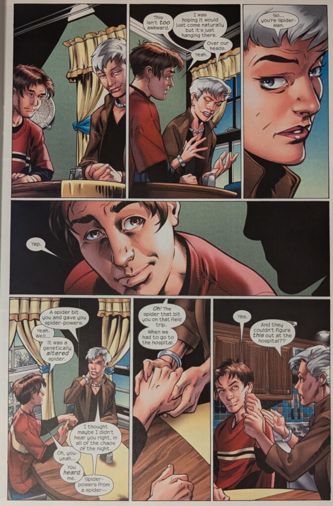 Ultimate Aunt May stays winning. What a great take on her. And how fascinating to compare this to ASM 38, to JMS and JRJR doing this whole thing. Some similar beats (And both stories drawn by the biggest Spider-Man artists since Romita, Sr., no less), but very different characters in very different places. The OG Peter had been lying to May for like 15 years. Ultimate Peter, less than one. And they’re so different, the 2 versions of each of them. I feel like both Peters were hiding their secret as much for themselves as for their Mays, but I think with this Peter, it feels so much more intense. He’s still just a kid, he’s scared. And I think both Mays were stronger than Peter gave them credit for, but THIS May, way, way more so. OG May was so kind in the moment, and yet she harbored a deep and understandable resentment for awhile. Ultimate May was so, so brutal at first, and now she’s on a whole other foot. It’s just neat to see how the 2 teams and the 4 characters handled this shared moment. I think both versions feel very honest and real and correct for their different universes. But… this is the Ultimate Universe. No deal with the devil is coming to reverse the situation. This is how it is from now on.