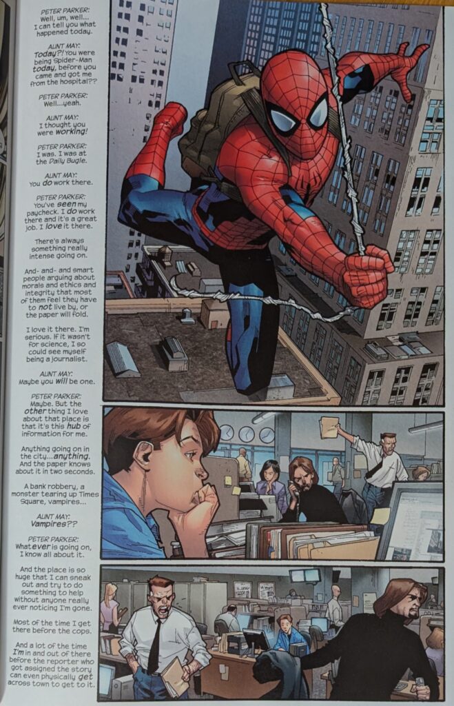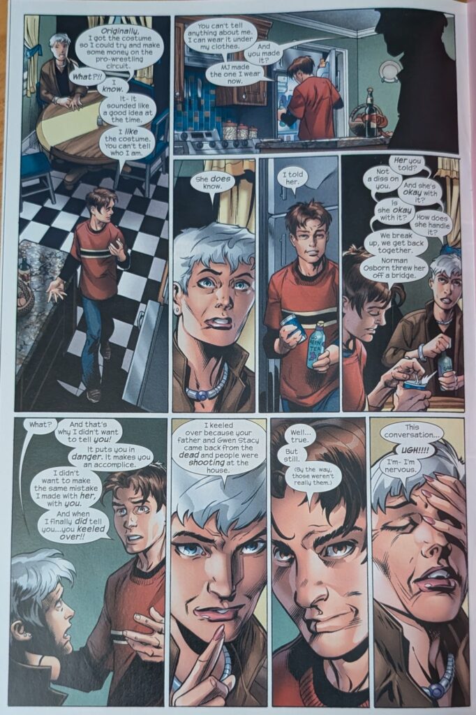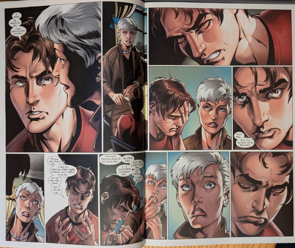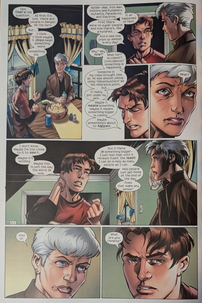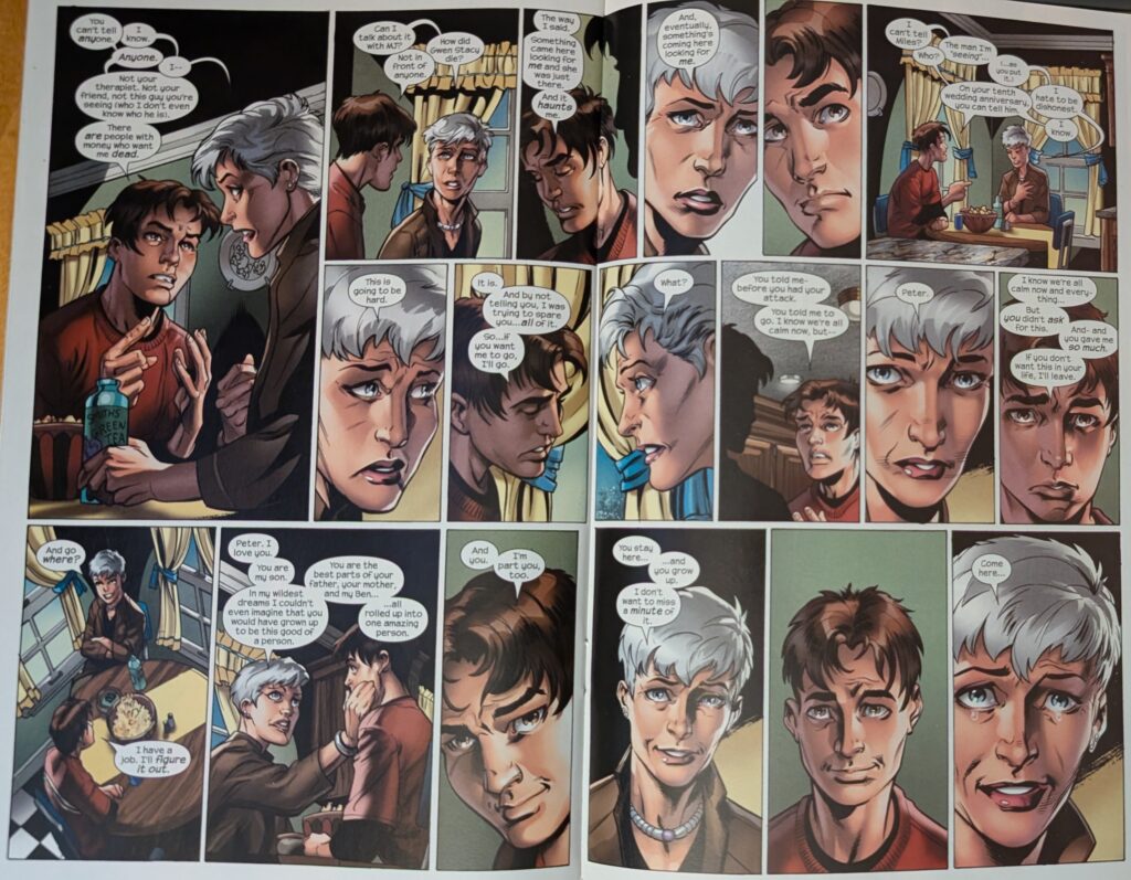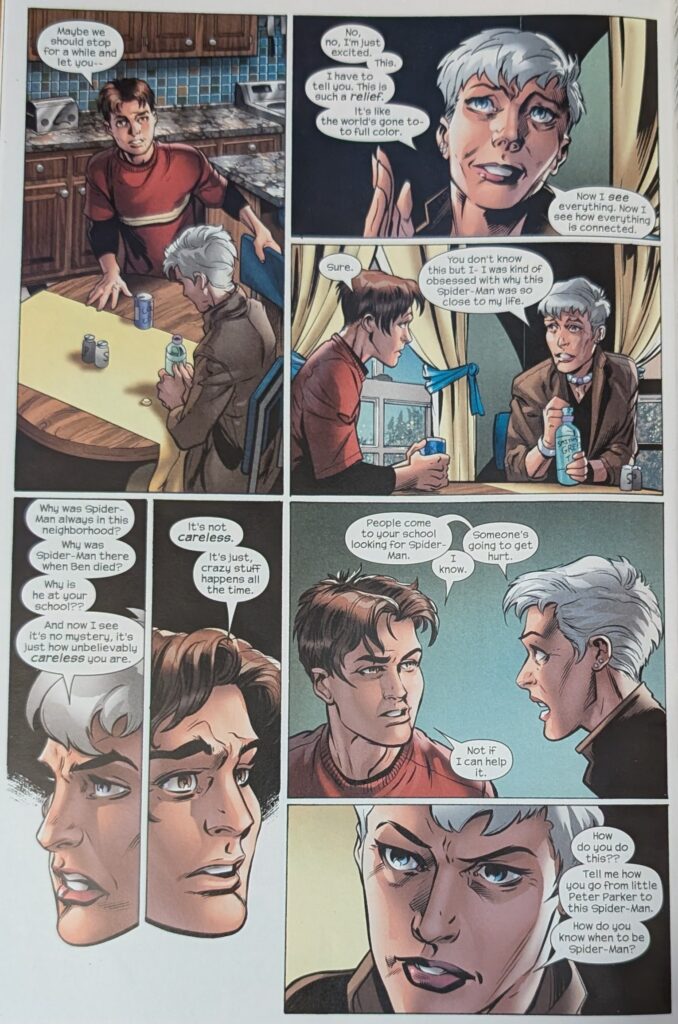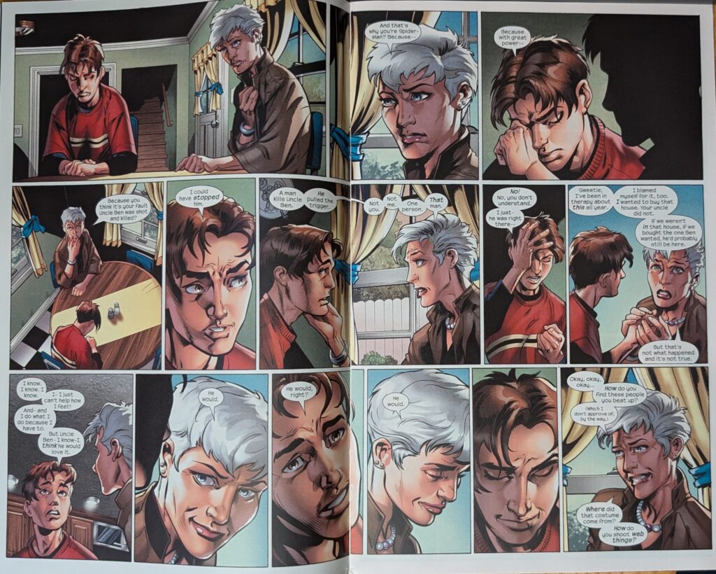 Across a signature Bendis 2-page spread, Peter explains that Norman Osborn is responsible for what happened to him, and that he’s the Green Goblin, and that Harry is an orange one. May is understandably uncomfortable with the violence in Peter’s life. He says he only fights bad people. May insists he has to finish high school, and he reassures her that he wants to, and that he’ll go to college, and be genetic and chemical engineer. When she asks why he feels he has to be Spider-Man, he hits her with great power and great responsibility, which she remembers as something Ben used to say. And you know what that means…