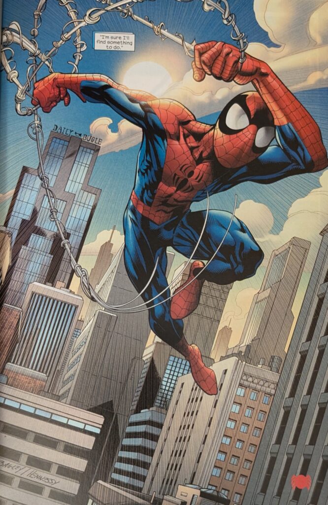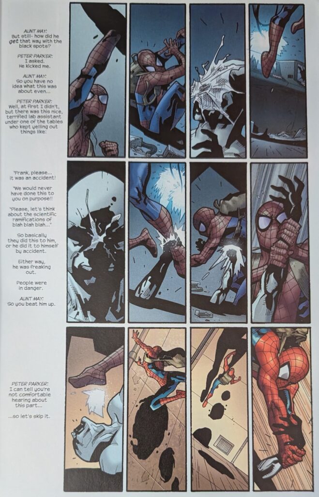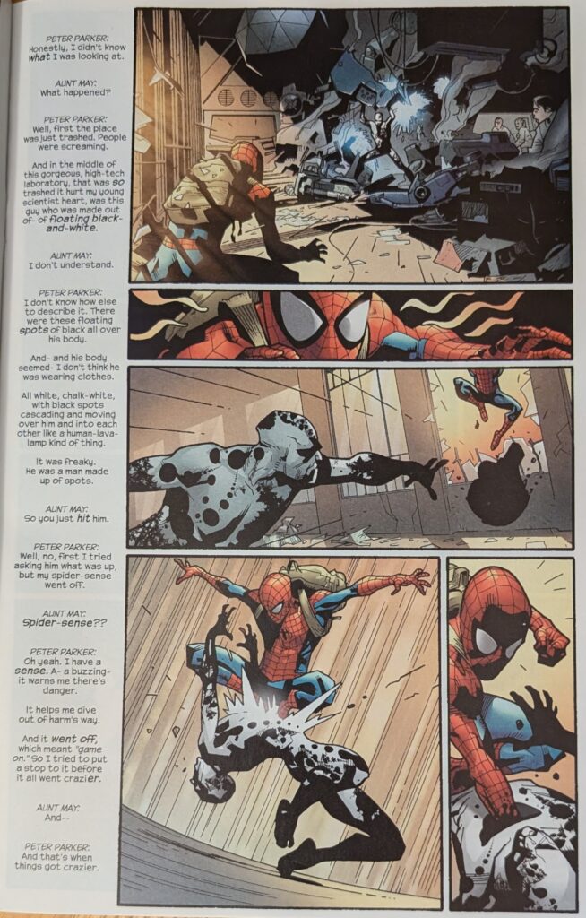 …cuz look at that action! Even in a compressed 12-panel grid, it really pops! We see Spider-Man put the Spot out of commission and flee the scene as Peter explains the cops are always showing up and shooting at him, and May is NOT cool with that, and then Bags is back.