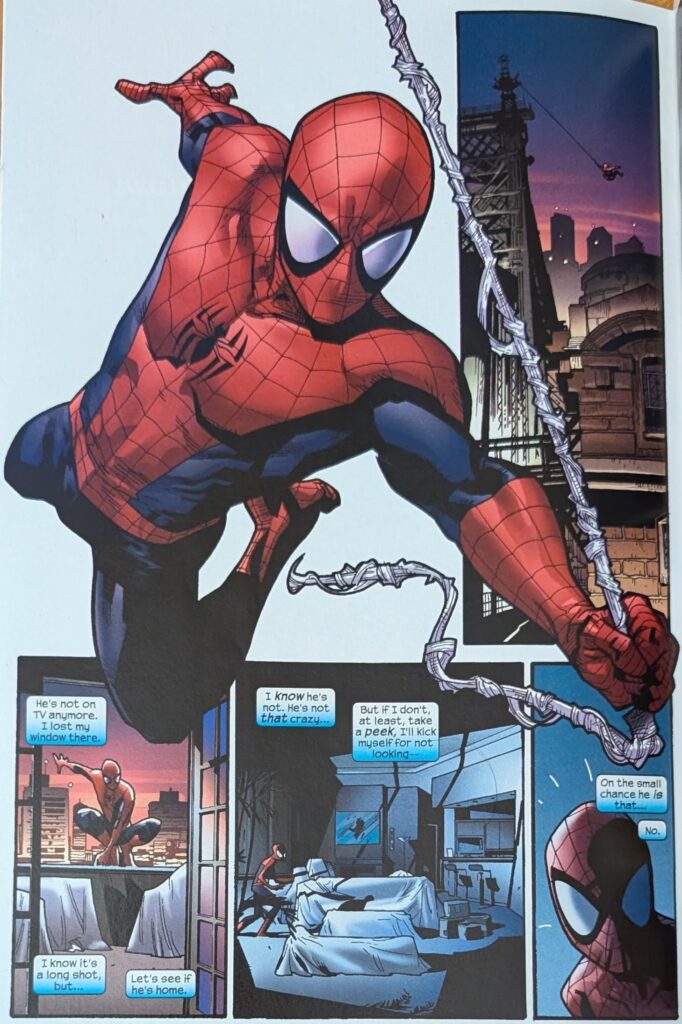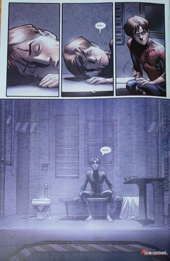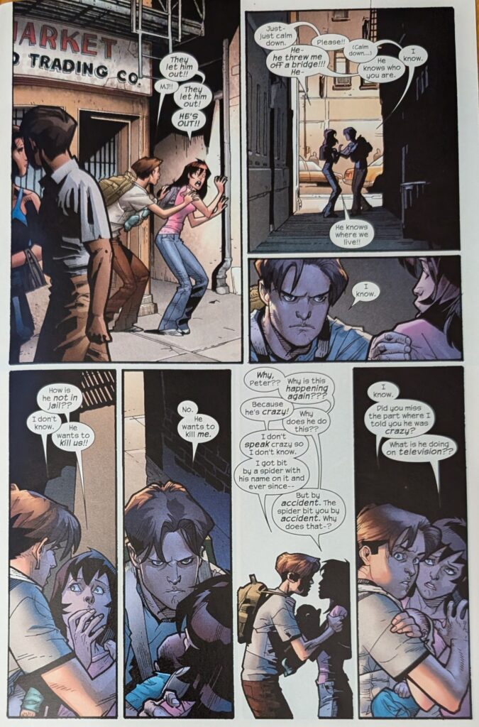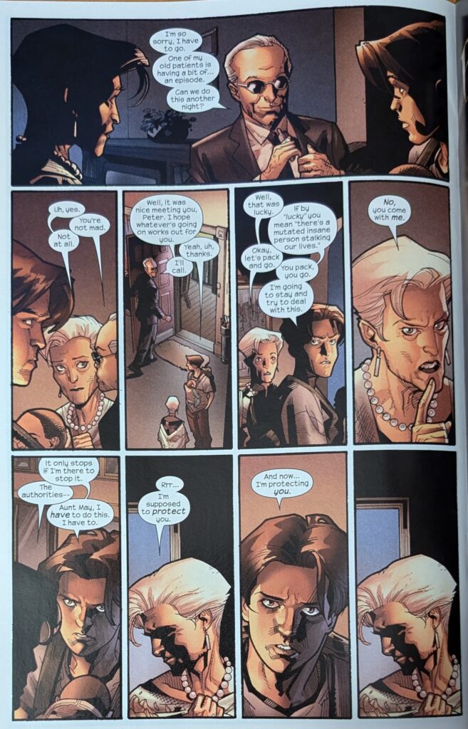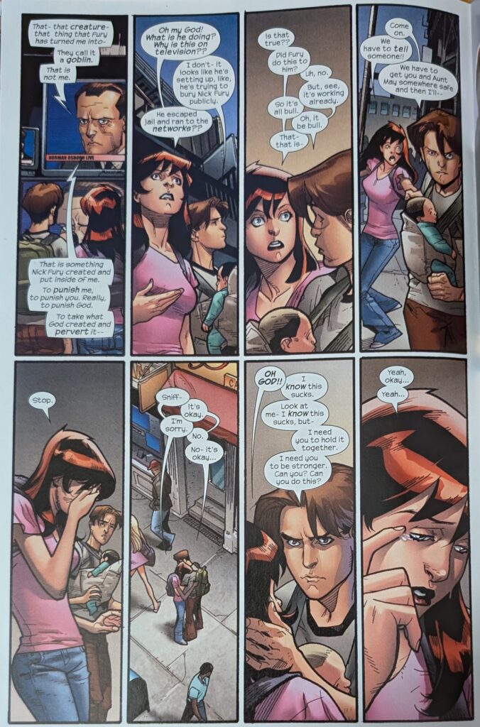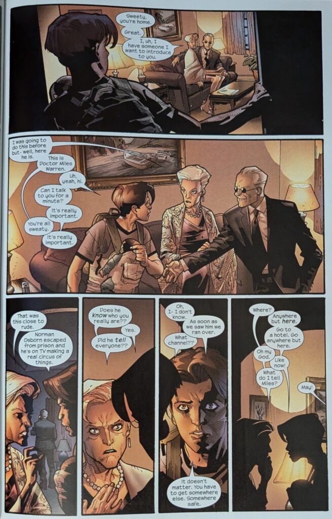 One wonders if MJ freaked out this bad during Ultimate Six. But I guess maybe people didn’t know what was going on for most of that. The kids get to Aunt May’s house and find someone is there. MJ freaks out, but Peter knows Norman didn’t just drive a car over. MJ is wondering what she’s going to tell her Mom when she drives up in her own car, yells that Osborn is loose and on TV, and to get in the car, because they’re leaving town. Which is all pretty wacky. With MJ safely bundled into a car leaving danger, Peter just has to worry about May.
