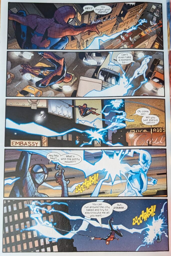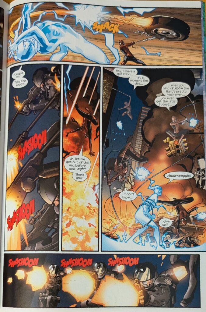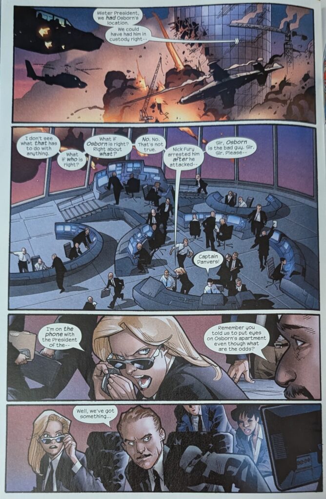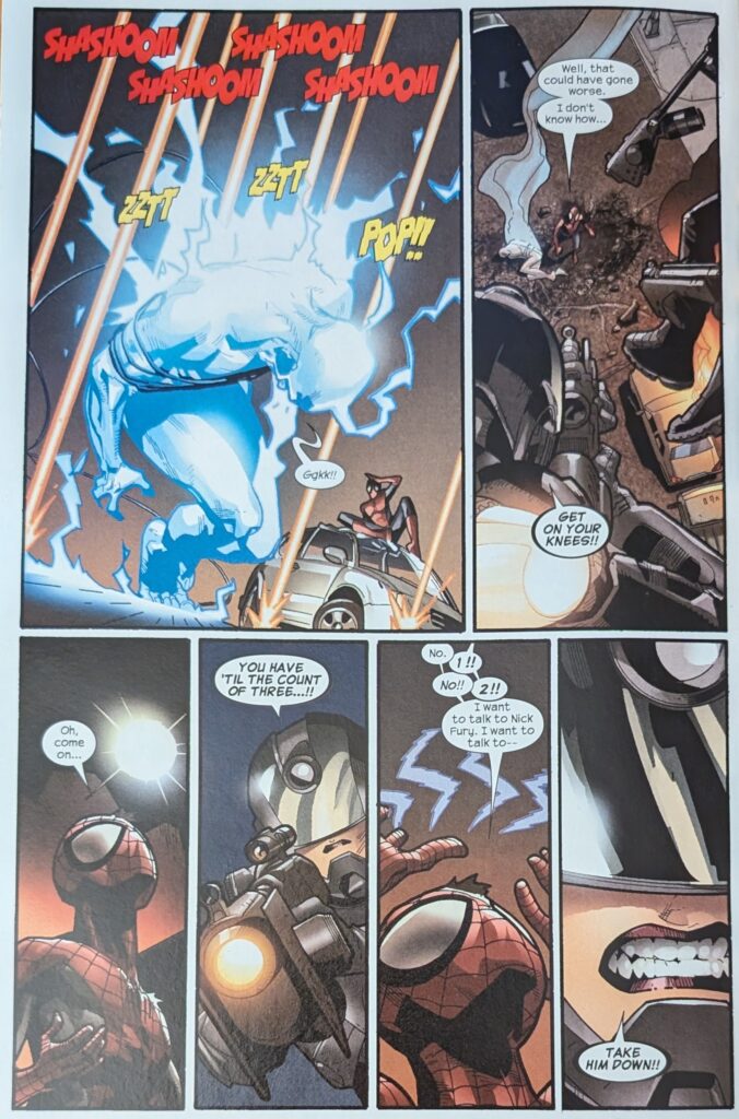 I really only ran this page because seeing it, I remembered I used that top panel as a signature image on the Bendis Board for awhile. But also, look at Immonen go. Spidey and Electro continue to have a truly thrilling chase fight for a couple more pages until Spidey gets thrown into a store, and while he’s in there, a bunch of jetpack-clad SHIELD agents appear and start shooting at Electro, chasing him down the street. Which makes a good distraction for…