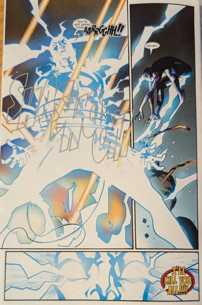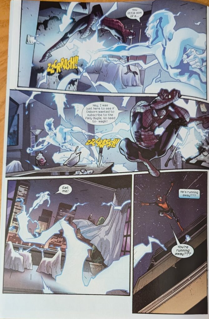I took this picture for a very specific reason that won’t pay off for years. That’s just how it goes sometimes. Spidey sees evidence that someone is in the house, and then someone emerges from the bathroom toweling off, but it’s Electro. Neither of them is too happy about this development, but now they gotta fight, it’s in the contract. Electro powers up and Spidey is dodging electricity all over Norman’s place. Meanwhile…