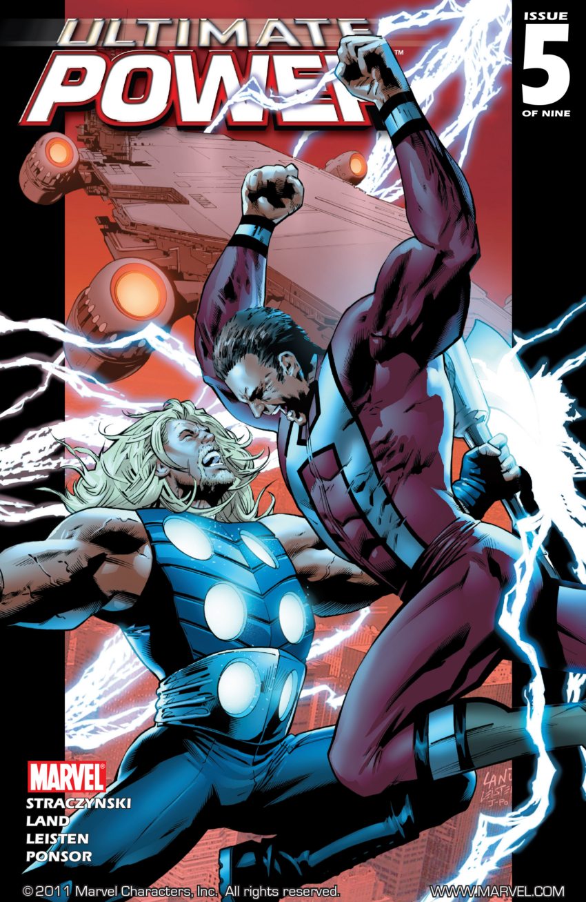 I don’t know what the Supreme Power analog of Captain Atom can or can’t do, but I know the real one can’t fly, and yet Land always has this guy floating in the air. I bet the Iron Men in this are the easiest swipes to source. Only a few people have drawn that suit at all, and given how few issues of the Ultimates had actually been published to this point, those who had hadn’t done it too often.