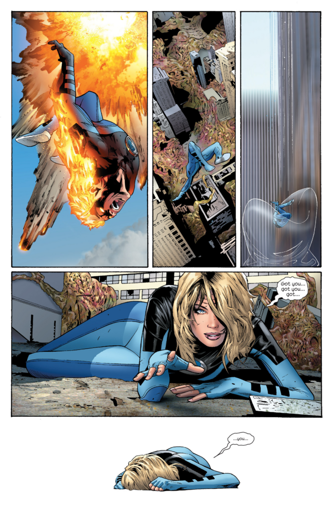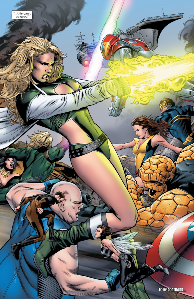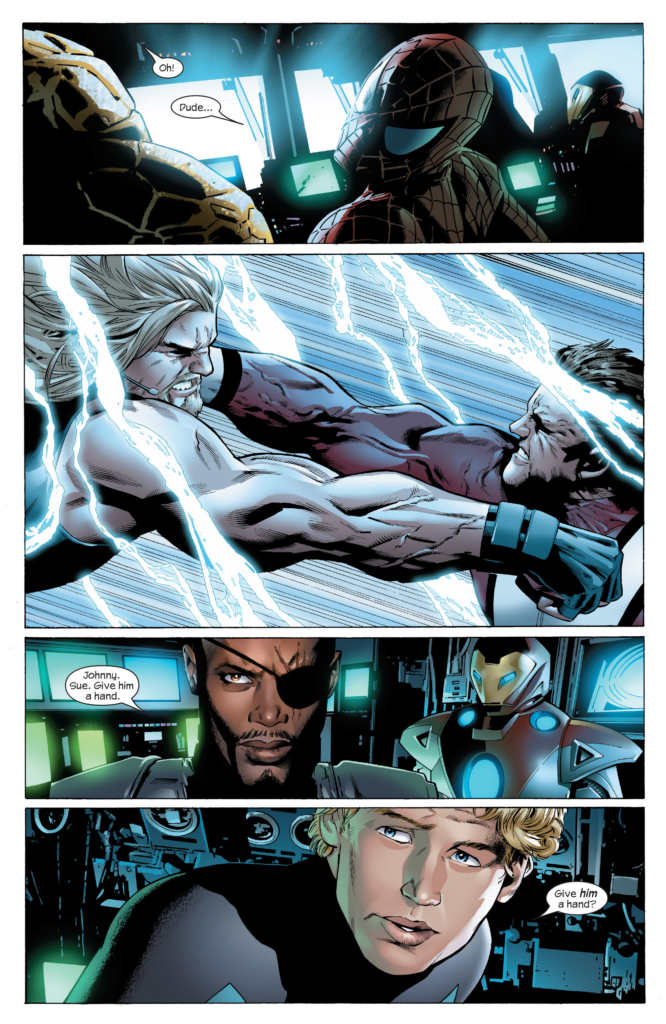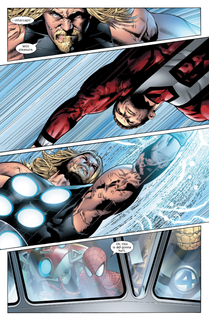 Spider-Man from the Spider-Man 3 movie poster. How’d it take this long for the live action Spider-Man to appear in this series? It takes another whole page for Sue & Johnny to enter the battle, the JMS issues are unbelievably padded. As they leave Thor, Sue & Johnny to fight Hyperion, Fury tells that Charest Spider-Man again and Captain America he can’t spare any of the others as they protest, saying they have to get Reed back at all costs.